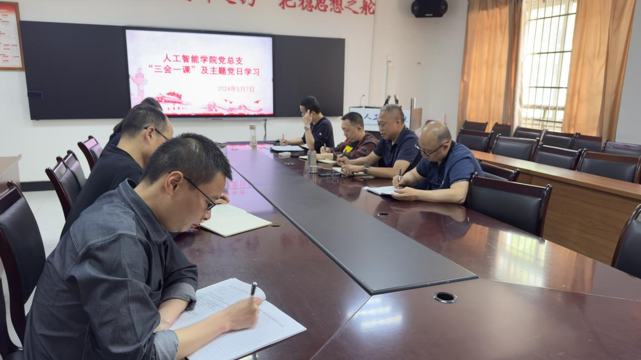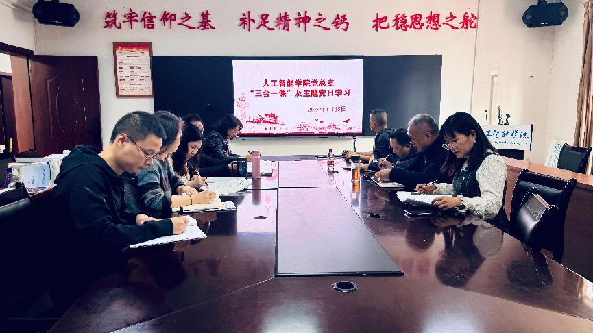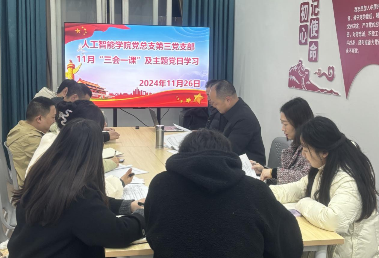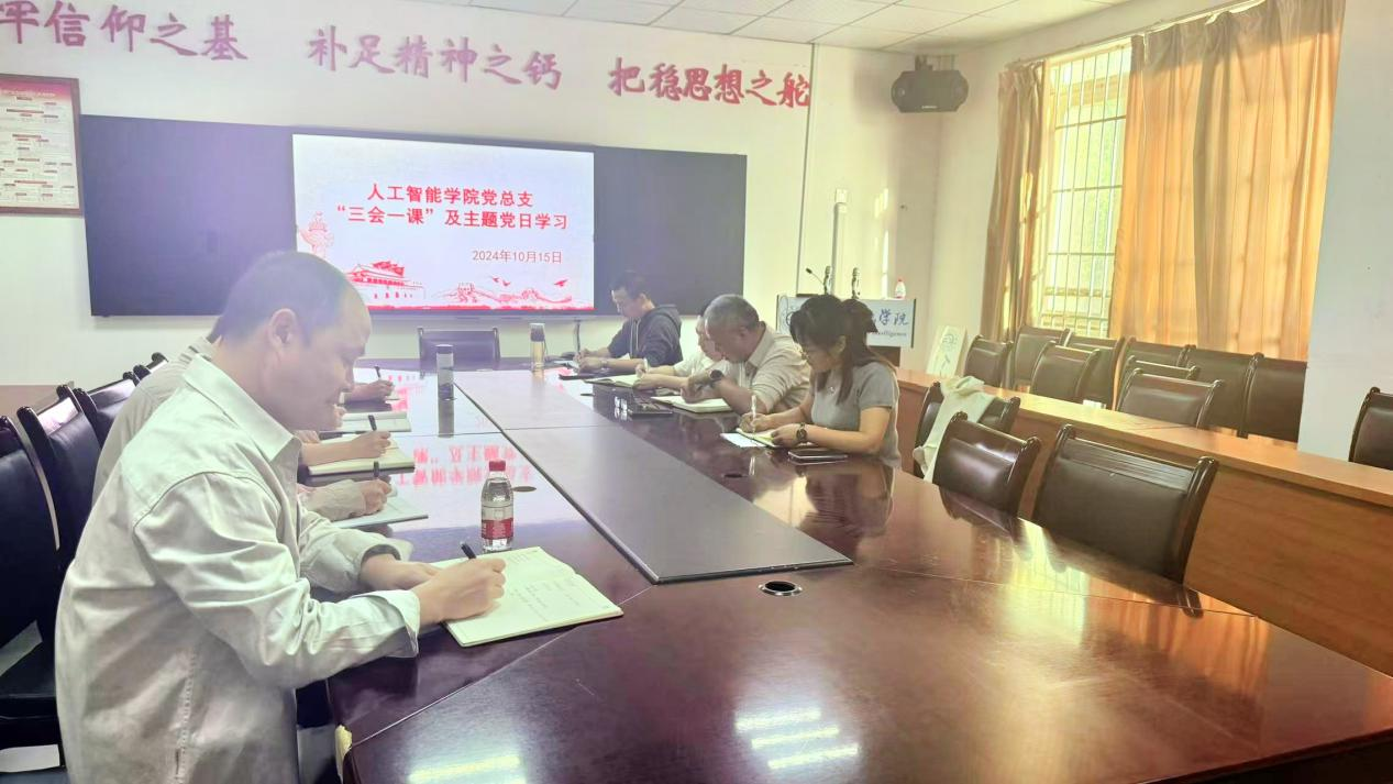 2024年11月5日,人工智能学院党总支在信科楼503开展11月“三会一课”和主题党日学习教育专题会。会议由人工智能学院党总支书记熊泽明主持,总支委员、二级学院中干、支部书记等9人参加。 会上,总支宣传委员杨勇组织学习了八项内容,具体包括:习近平总书记在庆祝中华人民共和国成立75周年招待会上的重要讲话精神 ;习近平总书记在省部级主要领导干部学习贯彻党的二十届三中全会精神专题研讨班开班式上的重要讲话精神;...