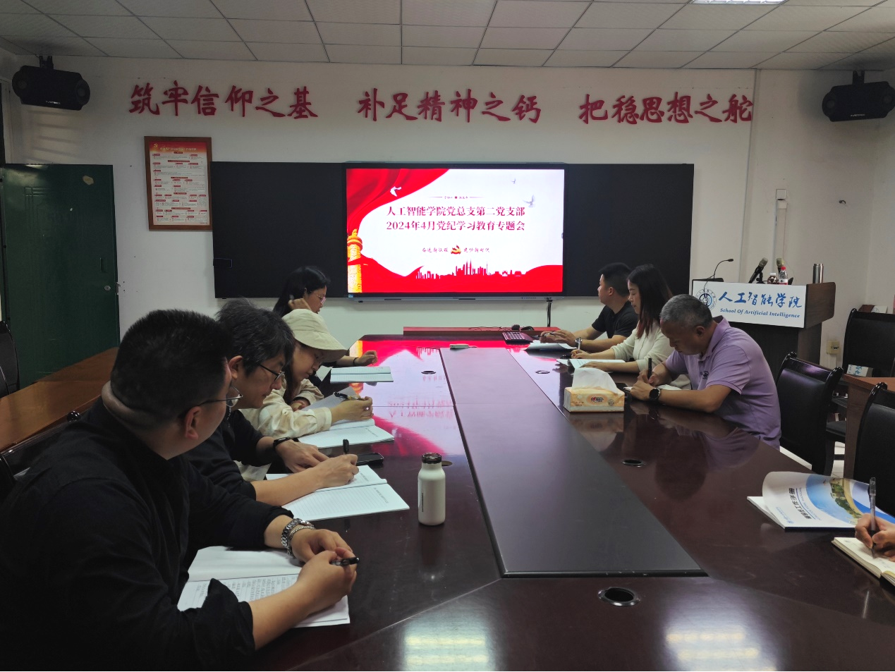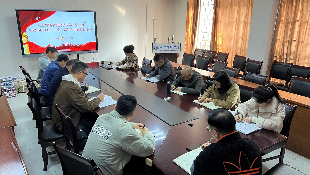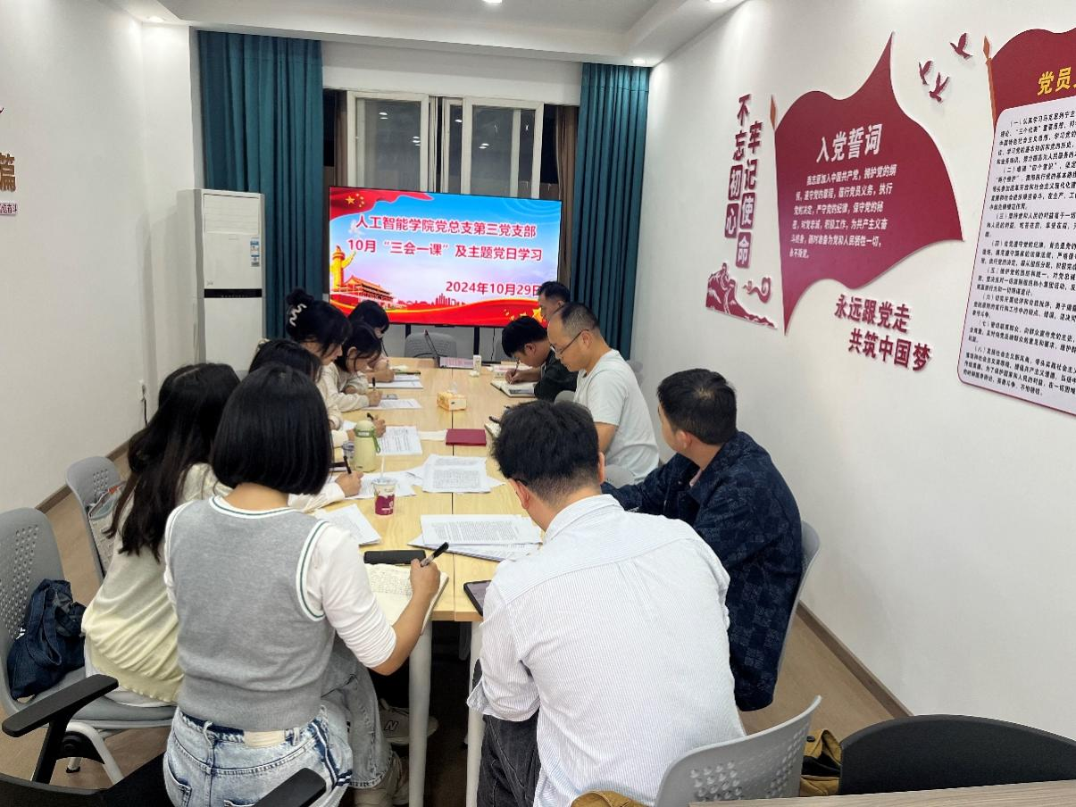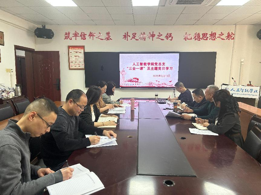 2024年11月5日,人工智能学院党总支在信科楼503开展11月“三会一课”和主题党日学习教育专题会。会议由人工智能学院党总支书记熊泽明主持,总支委员、二级学院中干、支部书记等9人参加。 会上,总支宣传委员杨勇组织学习了八项内容,具体包括:习近平总书记在庆祝中华人民共和国成立75周年招待会上的重要讲话精神 ;习近平总书记在省部级主要领导干部学习贯彻党的二十届三中全会精神专题研讨班开班式上的重要讲话精神;...