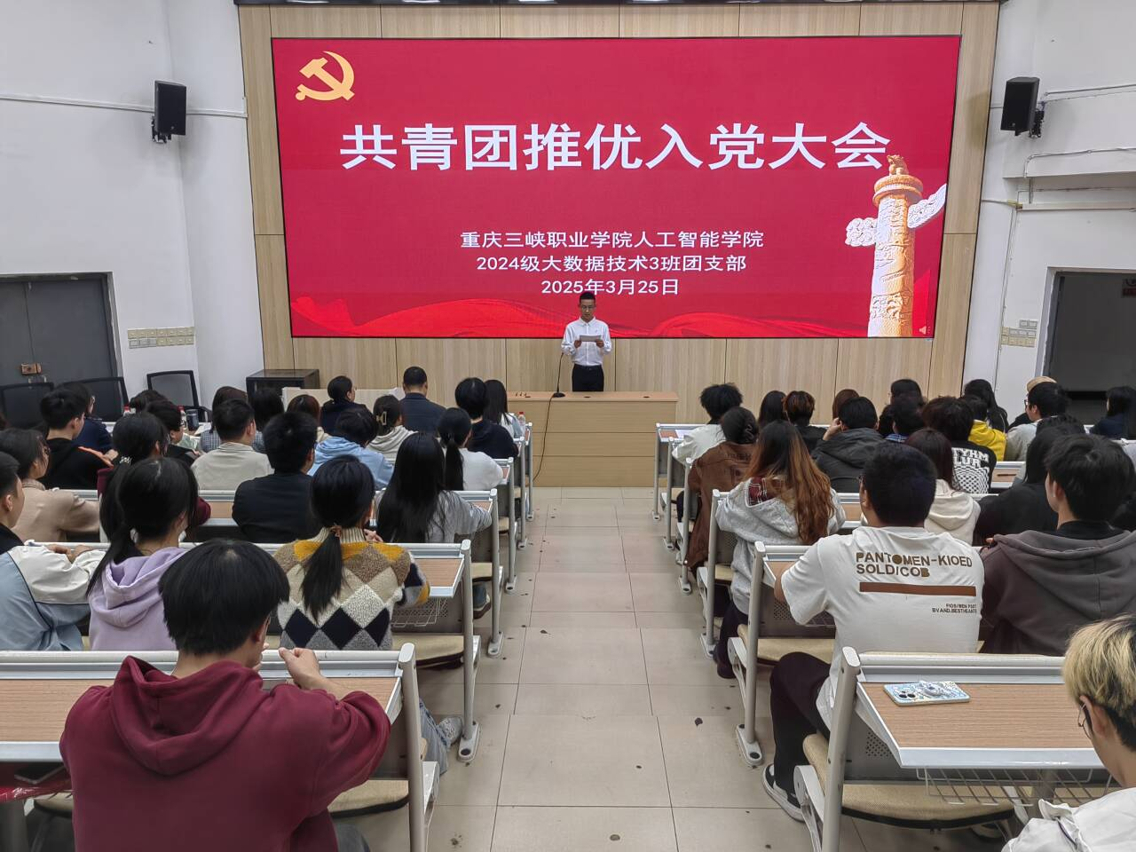 为积极响应党的号召、为党的事业输送更多新鲜血液和优秀青年,2025年3月25日12:40,人工智能学院党总支第三党支部在信科楼220教室组织召开2024级大数据技术3班推优入党观摩会。会议由团支书姚元来主持,学院党总支副书记丁翠娟、组织委员崔艳,第三党支部书记吴勇帑、宣传委员蒲彦钧,第二党支部书记雷蕾,2024级各专业辅导员、学生等150余人参加。 会议共有六项议程。首先团支书姚元来介绍“推优入党”的相关规定,讲...