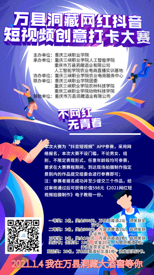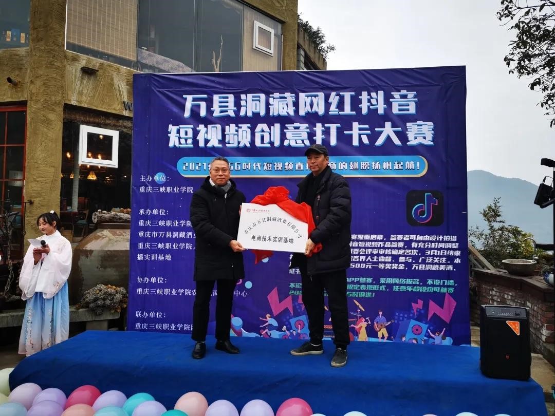 2021年1月4日上午10点,由重庆三峡职业学院主办,重庆三峡职业学院人工智能学院、重庆市万县洞藏酒业有限公司、重庆三峡职业学院人工智能学院农业电商直播实训基地承办,重庆市万县洞藏酒业有限公司赞助,举办的“万县洞藏网红抖音短视频创意打卡大赛”正式开幕。