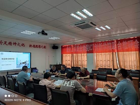 为了不断深化校企合作和产教融合,进一步提高教学资源开发质量,构建高效课堂,促进校企双方深入合作,提高职业院校与产业发展的契合度。7月21日下午,华晟经世ICT行业创新学院在信科楼会议室举行了2020-2021-2学期校企联合教研会,本次会议邀请了重庆三峡职业学院副书记张智、人工智能学院书记(兼院长)熊泽明、副书记骆伟、副院长余淼、教学科长杨勇、学工科长王蓉、物联网教研室主任吴勇帑、对外交流合作处文凤、大数据技术与应用专业秦阳鸿等院校主要领导出席会议。