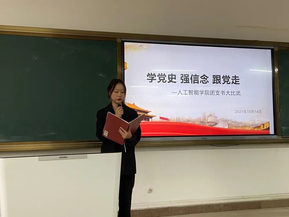为深入贯彻落实习近平总书记在党史学习教育动员大会上的号召,学习贯彻习近平总书记关于青年工作的重要思想。我院于2021年10月14日中午12点20在博雅楼102开展了第五届团支部书记实践能力大比武。参加此次比赛的评委和嘉宾有人工智能学院党总支副书记骆伟、专职组织员崔艳科长、学工科长王蓉老师、团总支书记张潆丹老师、辅导员兰小林老师以及各班学生代表。