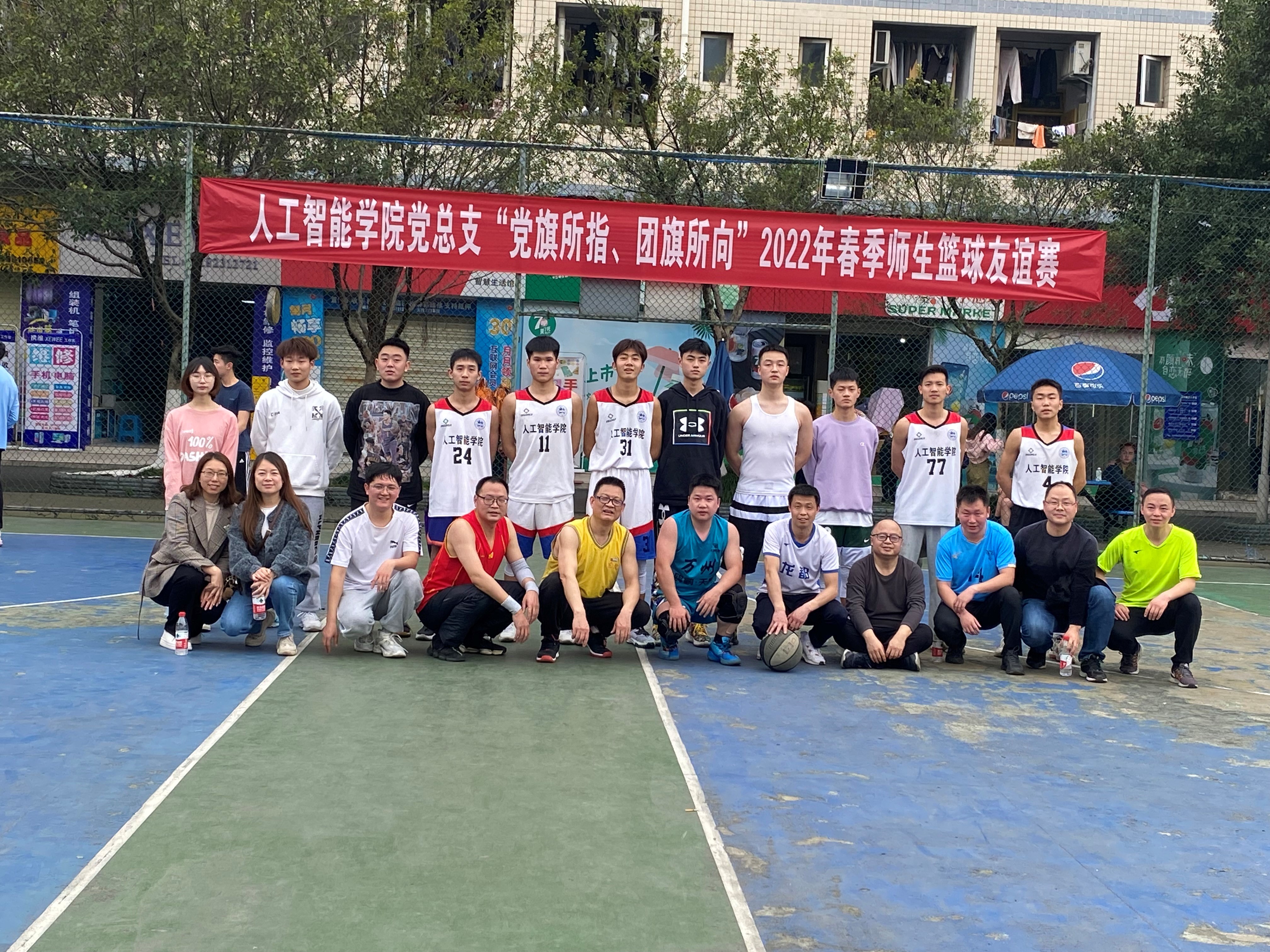 2022年3月10日12点30分,人工智能学院党总支开展了“党旗所指、团旗所向”2022年春季师生篮球友谊赛,本次比赛由人工智能学院第二党支部承办,人工智能学院全体教师、学生参加了本次篮球比赛。