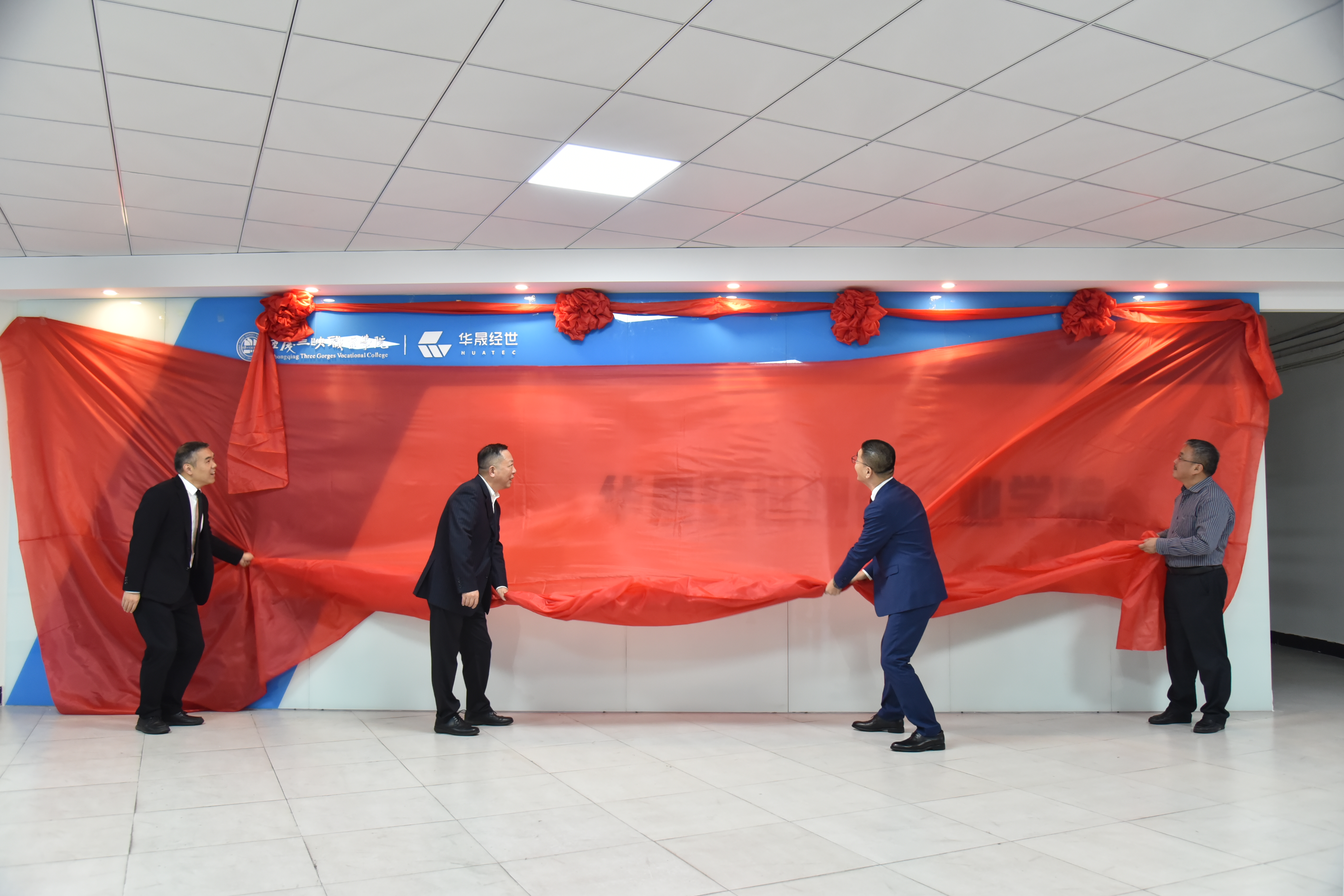 学校党委书记陈章、院长李炯光、华晟经世经总裁张宇、运营事业部总经理王辉共同为“华晟经世现代产业学院”揭幕,并宣布现代产业学院正式成立。