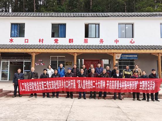 为深入宣传贯彻党的二十大精神,进一步巩固脱贫攻坚成果,让党的二十大精神在基层走深、走实,结合学校双高建设任务,2023年3月23日,人工智能学院党总支第三党支部,前往重庆市万州区恒河乡水口村,开展“深入宣传党的二十大精神,开启高质量乡村振兴新征程”主题党日活动。