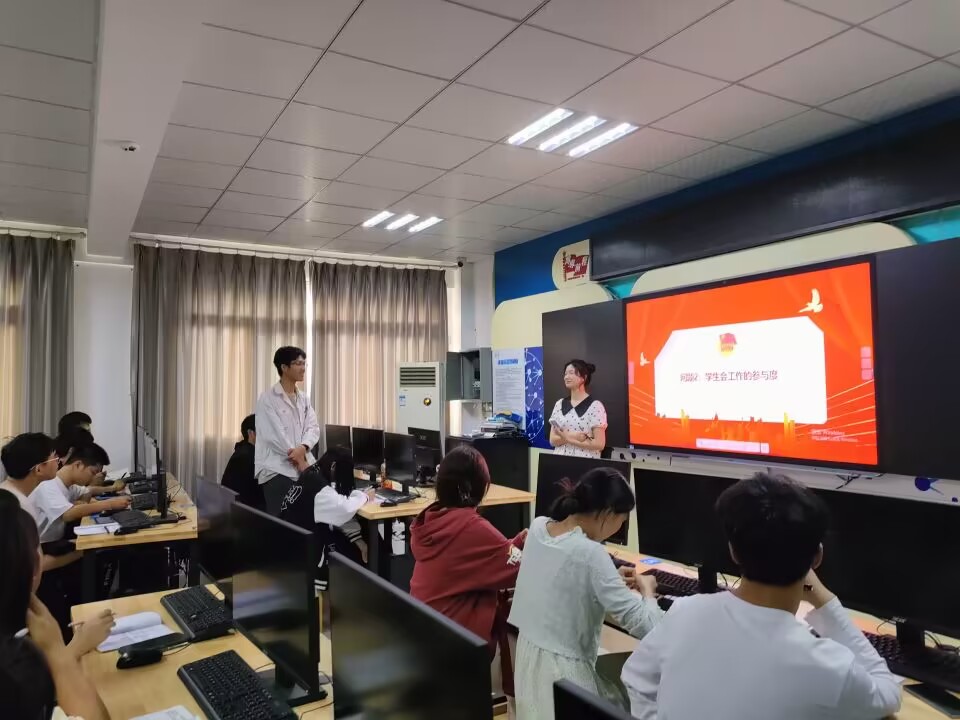 为深入宣传贯彻党的二十大精神和习近平总书记关于职业教育的重要指示批示精神;贯彻落实新修订的职业教育法和《关于深化现代职业教育体系建设改革的意见》,推动现代职业教育“一体两翼五重点”建设改革;宣传展示职业教育服务人的全面发展,在新形势下重视和加强高校学生干部队伍的培养和建设,切实提高学生干部的综合素质。2023年5月11日18点,人工智能学院团总支学生会“第一届学生干部培训班”第四讲《学生干部人才培养》在信科楼507教室举行,本次课程由人工智能学院团总支学生会主席陈学丹主讲。