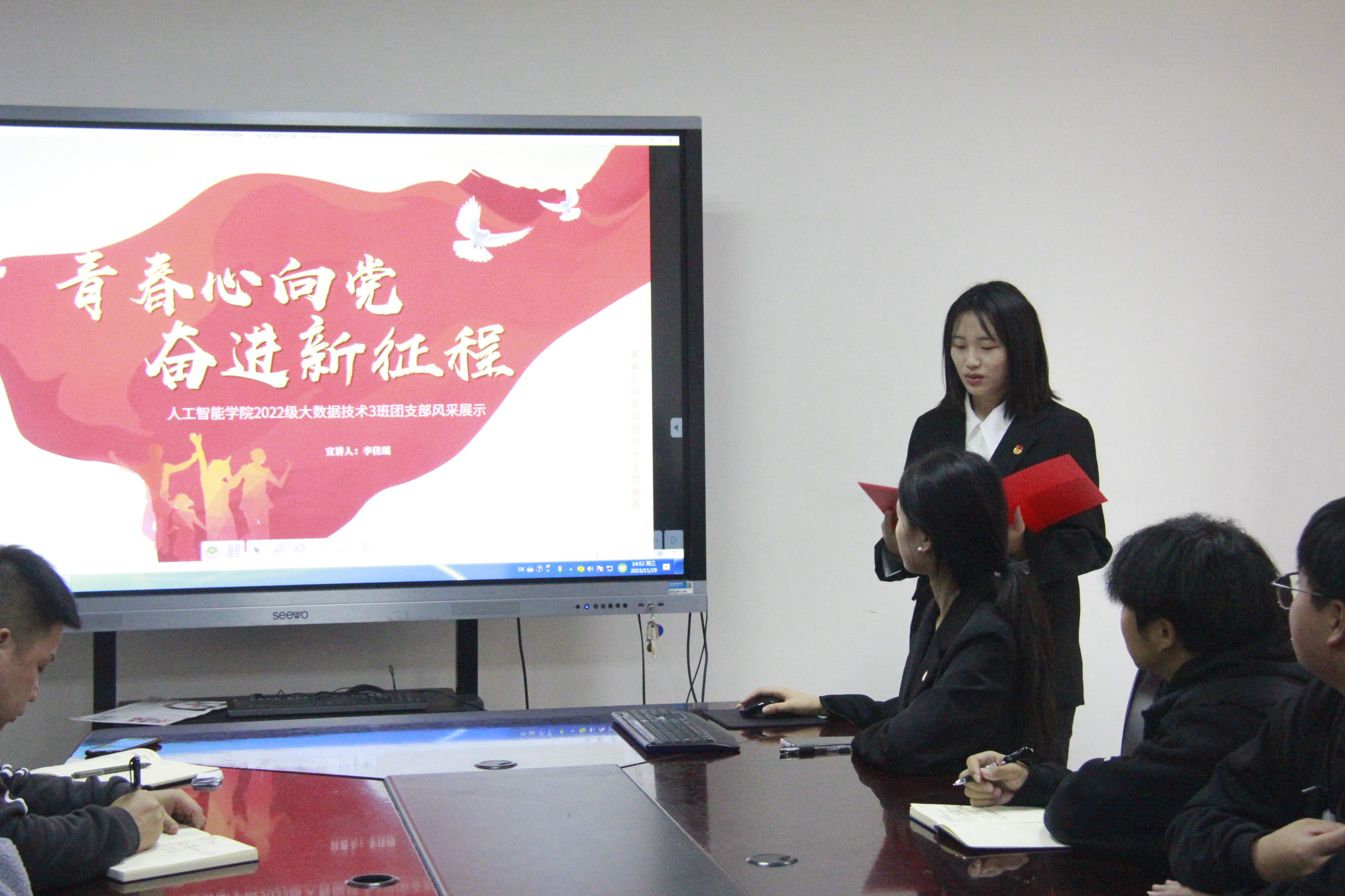 参加本次团支部风采大赛的班级有22级物联网应用技术2班和3班、22级大数据技术3班和4班,出席本次大赛的评委老师有党总支副书记骆伟,团总支书记张安汤以及辅导员刘倩。比赛开始,由主持人介绍比赛流程,各团支部依照抽签顺序进行展示。本次大赛采用PPT汇报和视频展示的形式,以“青春心向党·奋进新征程”为主题展开。