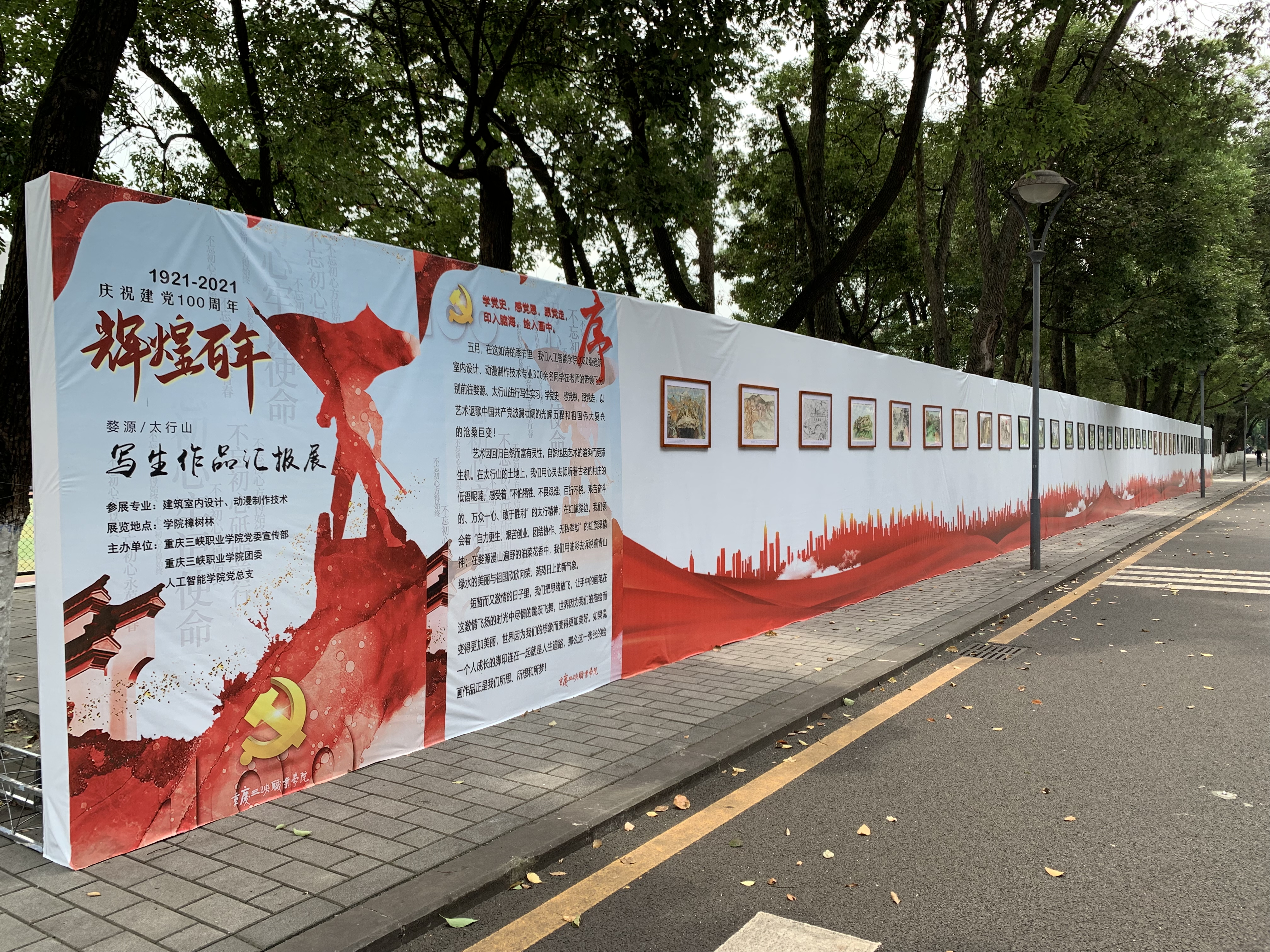 学党史,感党恩,跟党走,印入脑海,汇入画中。以艺术形式开展党史学习教育学习,讴歌中国共产党波澜壮阔的光辉历程和祖国伟大复兴的沧桑之变。2021年6月15日-6月18日,人工智能学院党总支在学校樟树林开展庆祝建党辉煌百年,2020级建筑室内设计和动漫制作技术专业学生写生作品汇报展。本次写生作品汇报展得到学校宣传部和团委的大力支持,展出写生作品300余幅,其中红色写生作品40幅。