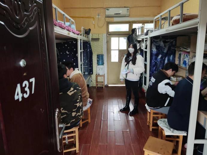 面对严峻复杂的疫情形势,我院学工队伍入住学生公寓,24小时在岗在线,和学生同吃同住。我院领导和辅导员们坚持每天深入学生宿舍,关心学生们的思想和心理状况,并引导学生要时刻保持积极乐观的健康心态。