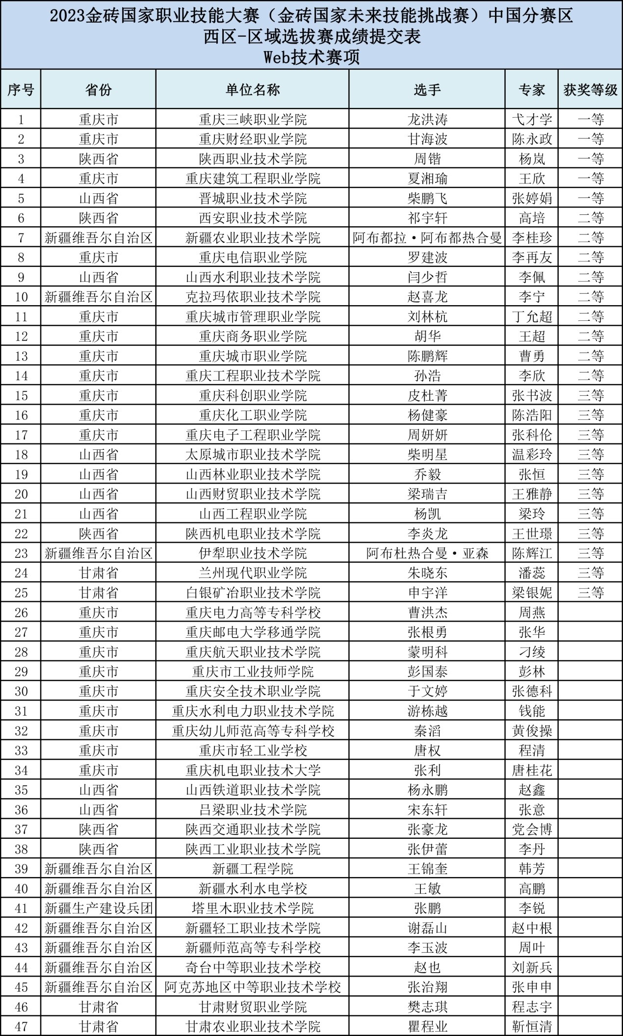 2023年9月23日,共有来自陕西、山西、新疆、甘肃、重庆等47所院校选手参加的2023年金砖国家职业技能大赛Web技术赛项西区选拔赛成功举办。我院由弋才学老师指导的软件技术2021级龙洪涛同学获得“web技术”赛项第一名和一等奖的好成绩,成功晋级全国决赛。