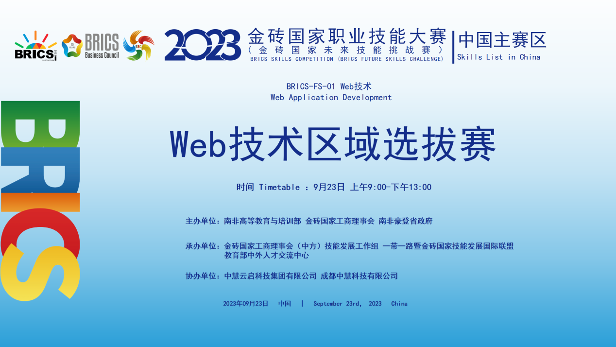 比赛由南非高等教育与培训部、金砖国家工商理事会、南非豪登省政府主办,金砖国家工商理事会(中方)技能发展工作组、一带一路暨金砖国家技能发展国际联盟、教育部中外人文交流中心组织,中慧云启科技集团有限公司和成都中慧科技有限公司协办。