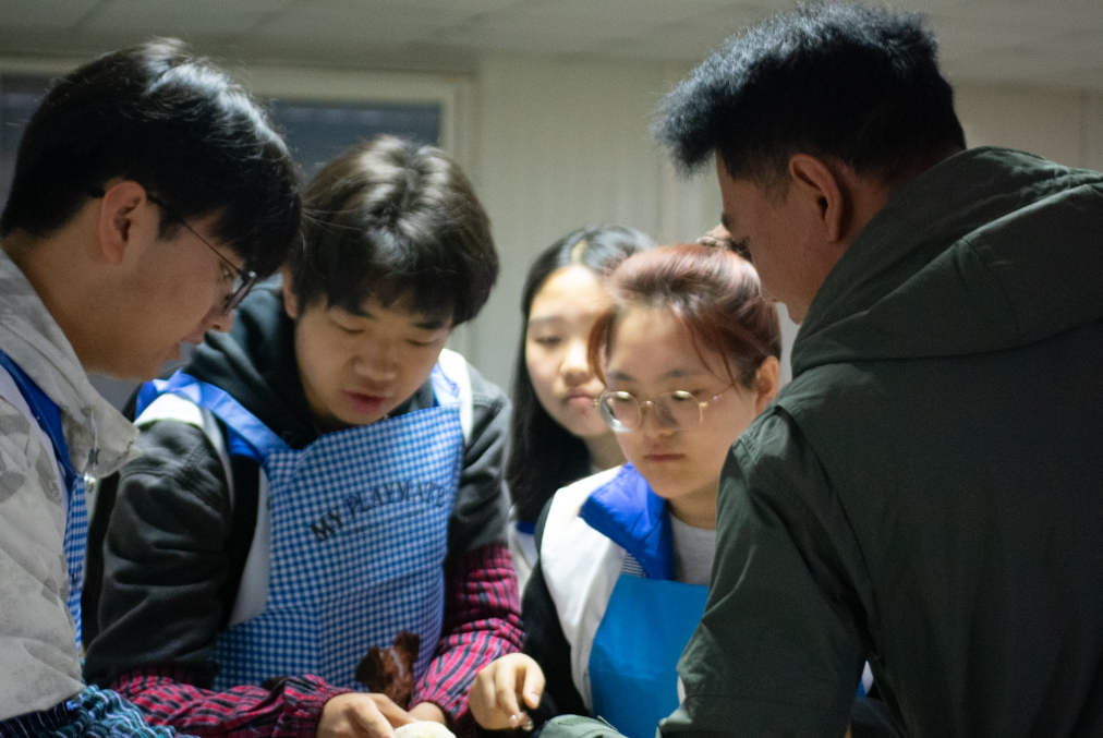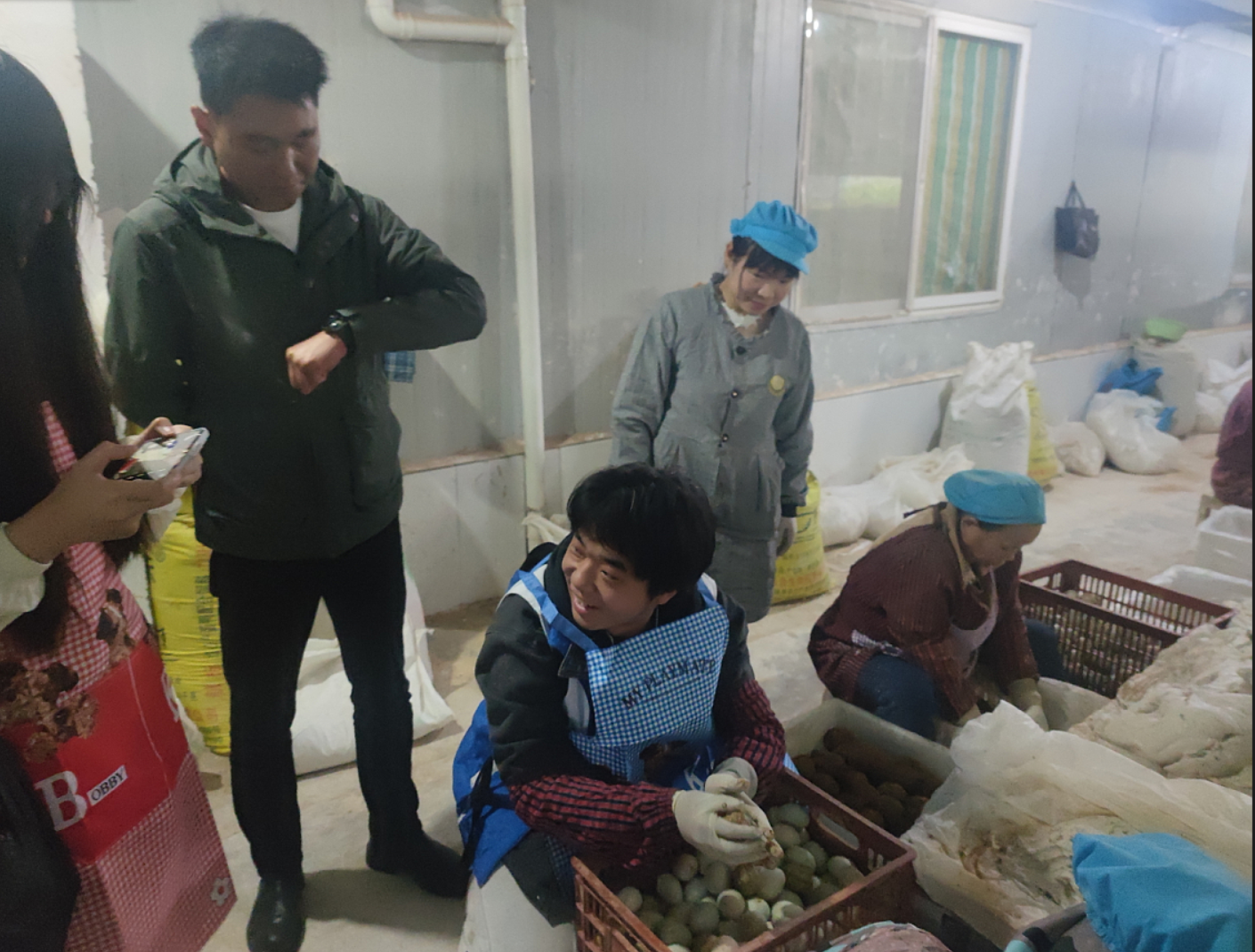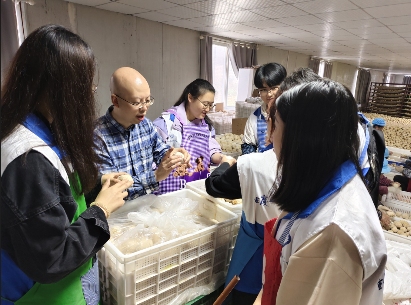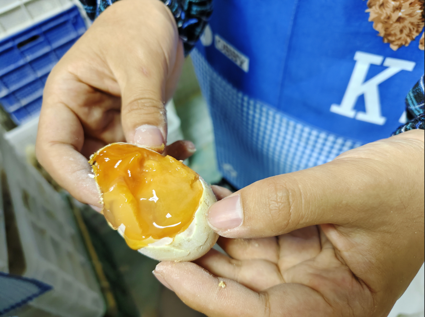同学们在盛源丰皮蛋厂仔细聆听了皮蛋厂负责人陈总对于皮蛋加工整个流程的介绍,并就生产、检测等环节中的各种问题与陈总进行了友好的交流。同时,同学们按生产工作要求规范着装,在现场工人的指导下,参与了包裹皮蛋和检测皮蛋等重要加工环节。