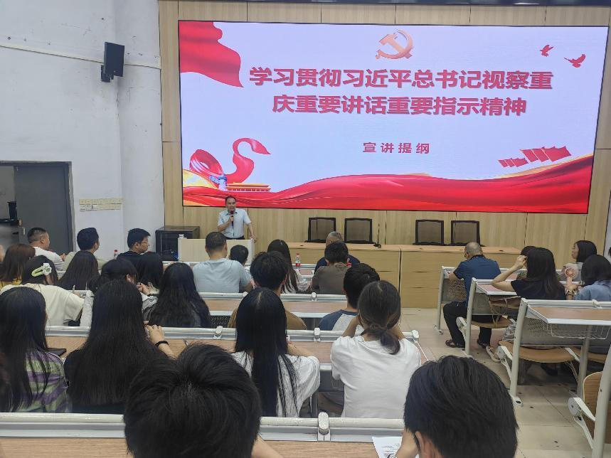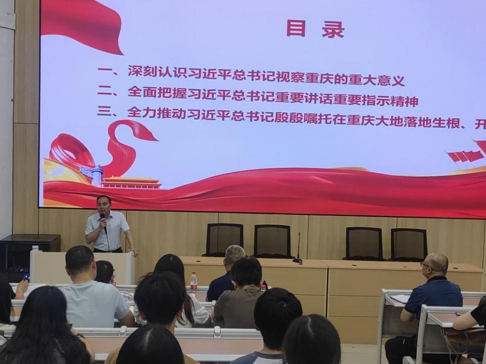 米密书记以“学习贯彻习近平总书记视察重庆重要讲话重要指示精神”为题,从“深刻认识习近平总书记视察重庆的重大意义”、“全面把握习近平总书记重要讲话重要指示精神”、“全力推动习近平总书记殷殷嘱托在重庆大地落地生根、开花结果”等三个方面对习近平总书记视察重庆重要讲话重要指示精神进行了详细解读。最后他强调,我们要更加紧密地团结在以习近平同志为核心的党中央周围,牢记重托、勇担使命,发挥优势、积极有为,狠抓落实、埋头苦干,全面贯彻党的教育方针,严格落实立德树人根本任务,坚持党建引领,有力推进学校高质量发展,为新时代新征程全面建设现代化新重庆贡献智慧和力量。