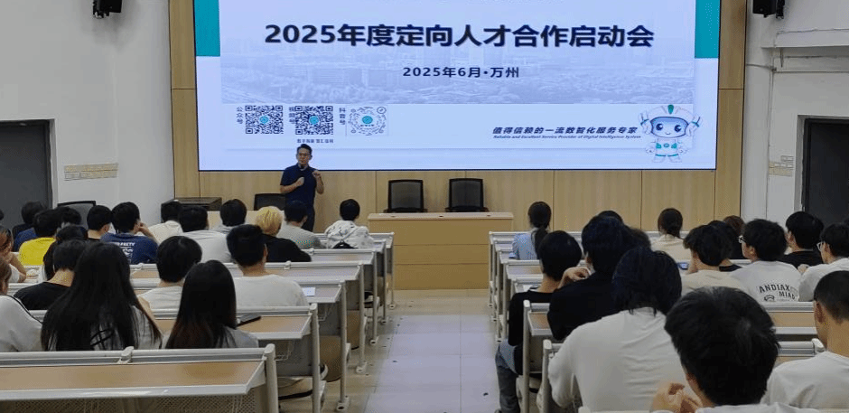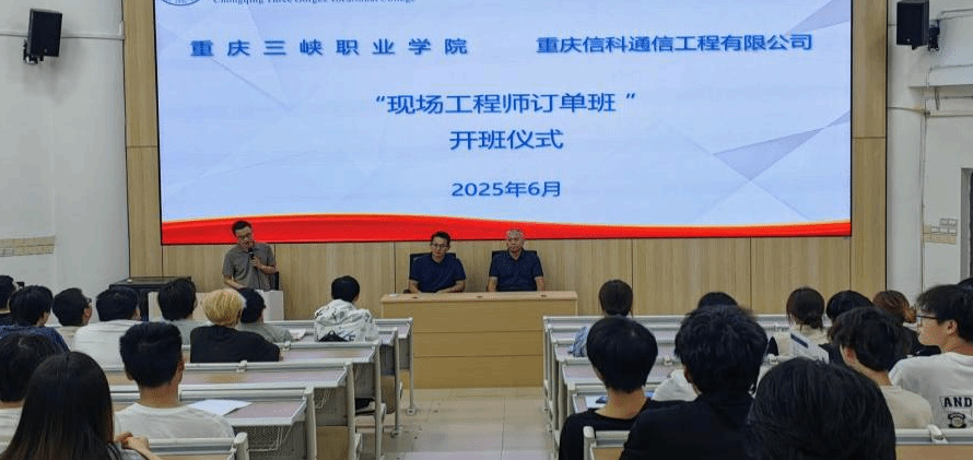 2025年6月12日,人工智能学院和重庆信科通信工程有限公司合作开班的现场工程师订单班第二期开班仪式,在信科楼220举行。人工智能学院党总支书记、院长熊泽明、现代移动通信技术专业主任袁枫、重庆信科通信工程有限公司设备商BG 全国产教融合负责人苏松及现代移动通信技术专业、大数据技术专业师生共140余人参加。开班仪式由现代移动通信技术专业主任袁枫主持。