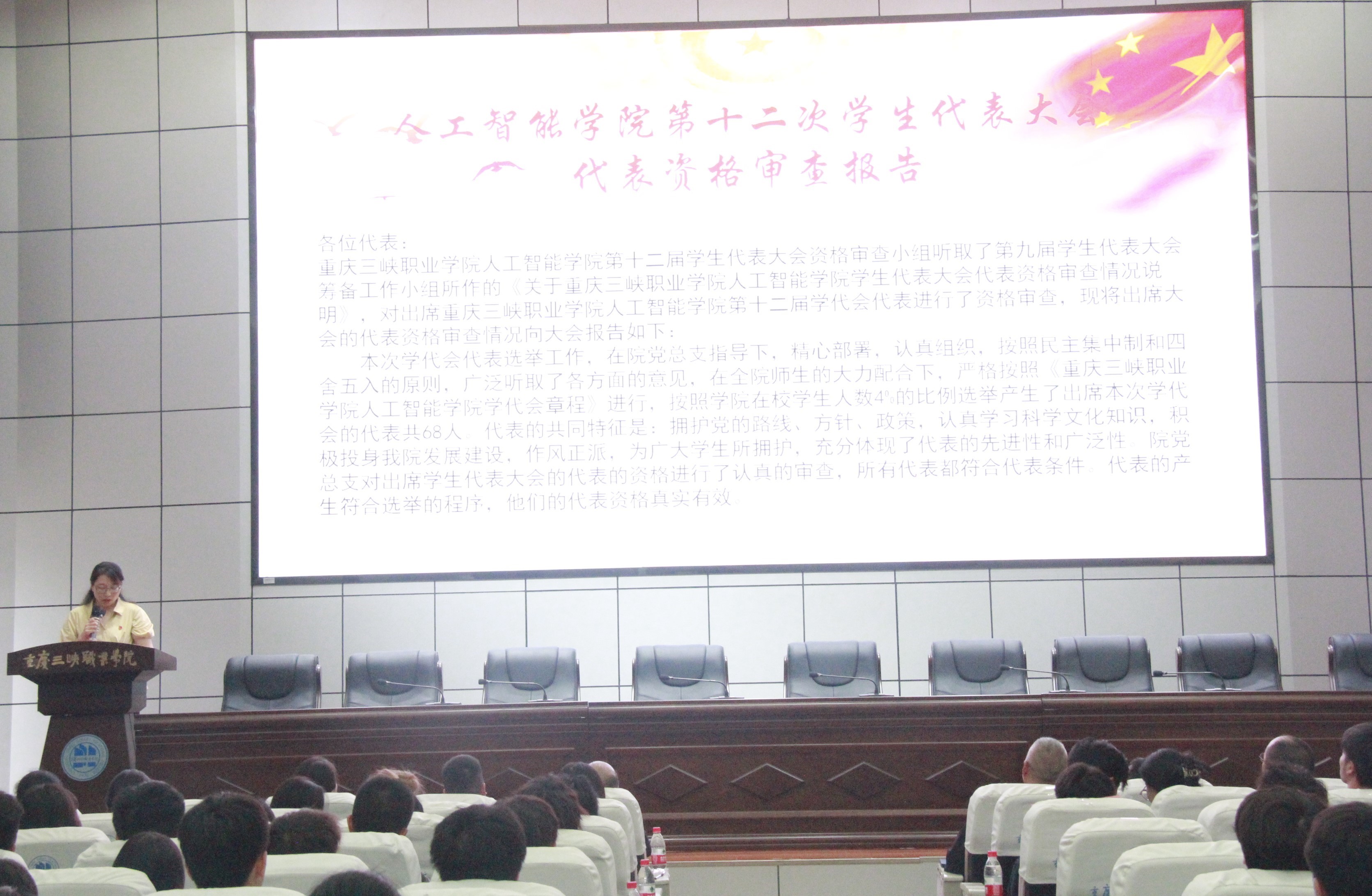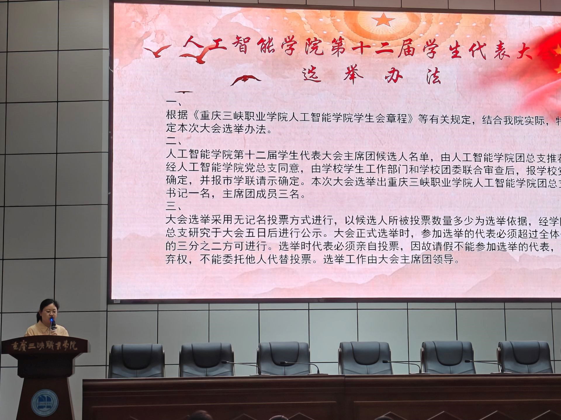 2023年10月17日,重庆三峡职业学院人工智能学院第十二次学生代表大会在博雅楼学术报告厅成功召开。出席本次会议的有人工智能学院党总支书记、院长熊泽明、党总支副书记骆伟、副院长余淼、第二党支部书记雷蕾、第三党支部书记吴勇帑、专职组织员崔艳、学工干事黄玲、团总支书记张安汤、还有辅导员王驹老师、范国兴老师、刘倩老师以及各板块学生代表。本次会议由我院学生向希、张林芝主持。