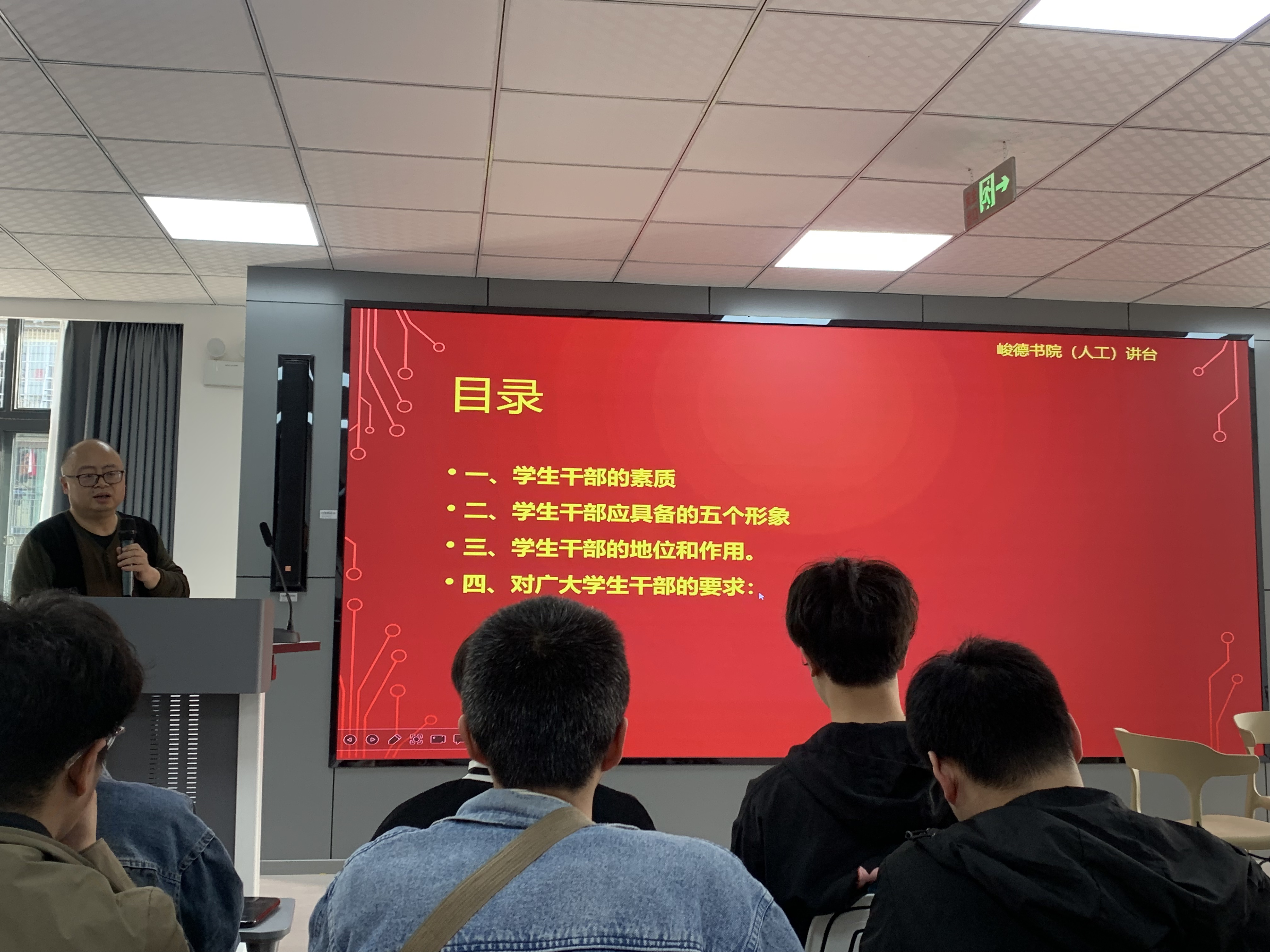 在课上他希望我们作为学生干部能够全面提升自身修养和综合素质,发挥“星星之火可以燎原”的作用,做好先锋榜样,影响和带动更多的青年学生不忘初心、不辱使命,成为坚定的马克思主义信仰者。并为我们所有学生干部提出以下几点要求,一是加强政治素养,应当立鸿鹄志、葆爱国心,坚定拥护社会主义;二是理论结合实际,应追求卓越、全面发展,勇于践行社会主义;三是争当先锋模范,应当甘于奉献、敢于担当,积极传播社会主义。鼓励我们在一次次的锻炼中成为一名优秀的新时代高校学生干部。