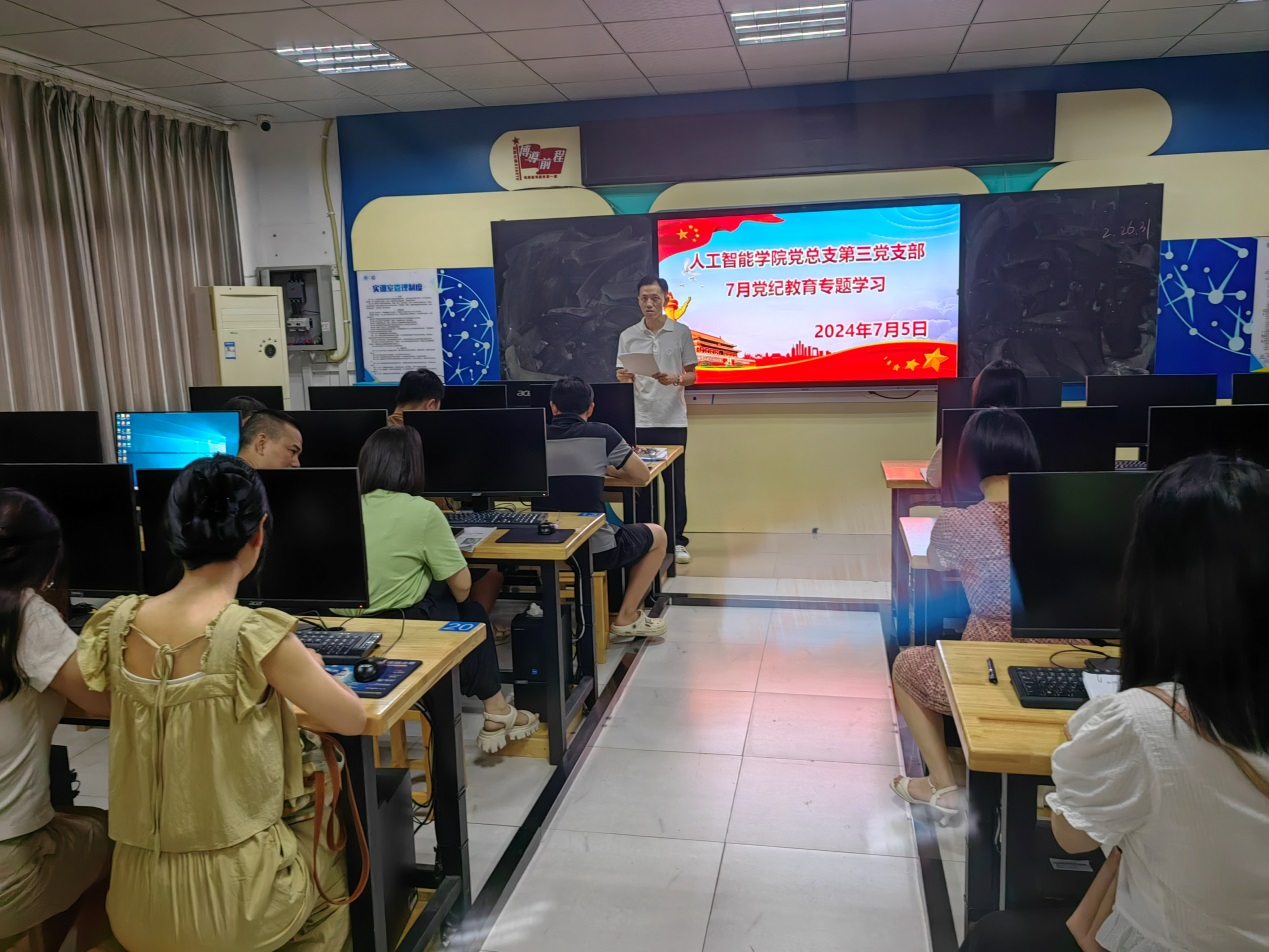 2024年7月5日11:45,人工智能学院党总支第三党支部在信科楼507教室开展7月党纪教育专题学习。会议由宣传委员蒲彦钧主持,支部11名党员教师参加。