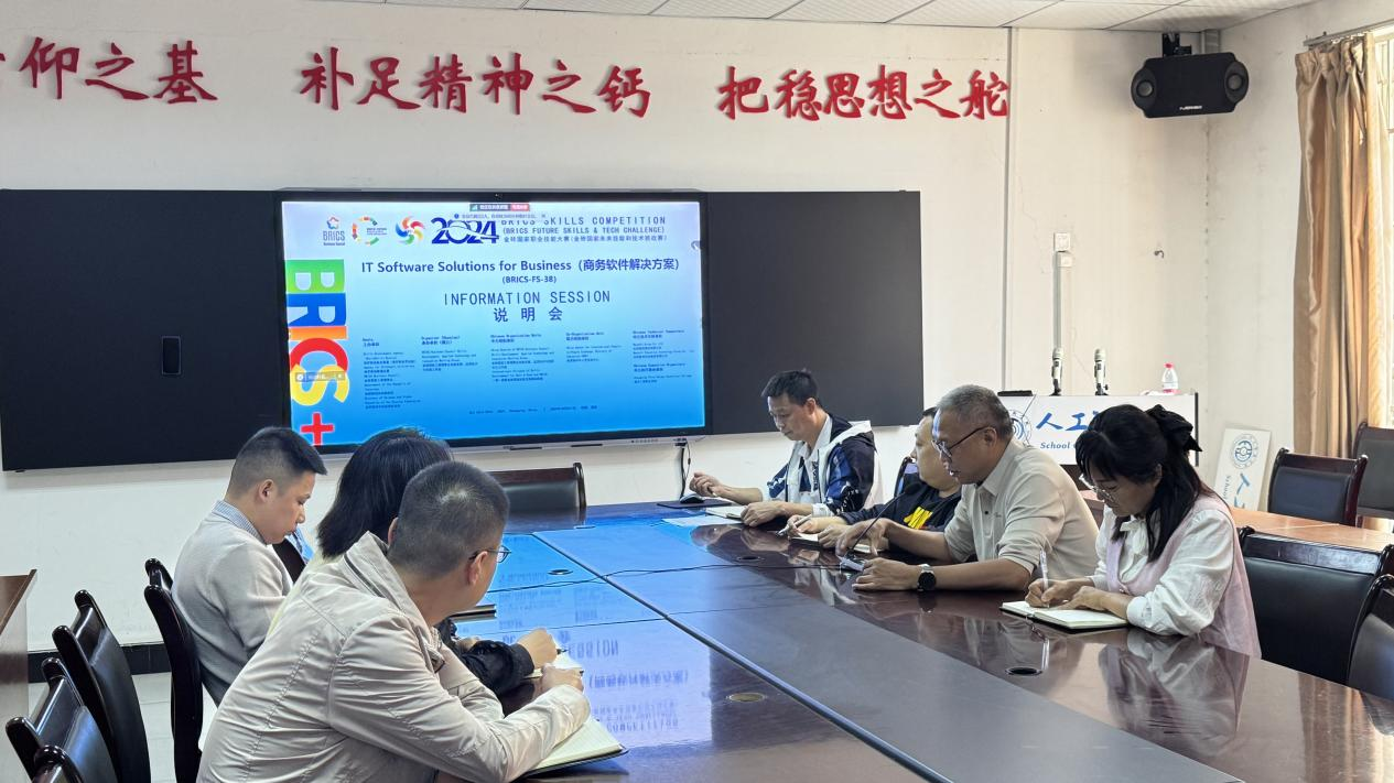 2024年10月25日,2024年金砖国家未来技能和技术国际挑战赛“商务软件解决方案”赛项重庆市选拔赛在我校成功举办。来自重庆市职业院校21支队伍报名参赛。 在说明会上,人工智能学院党总支书记、院长熊泽明出席并致辞,并代表承办方热烈欢迎各位领导、专家以及参赛队伍的到来,对为本次大赛付出辛勤劳动的所有领导、专家、同仁们表示衷心的感谢,竞赛裁判长许建豪、人工智能学院副院长余淼、党总支副书记丁翠娟等参加会议...