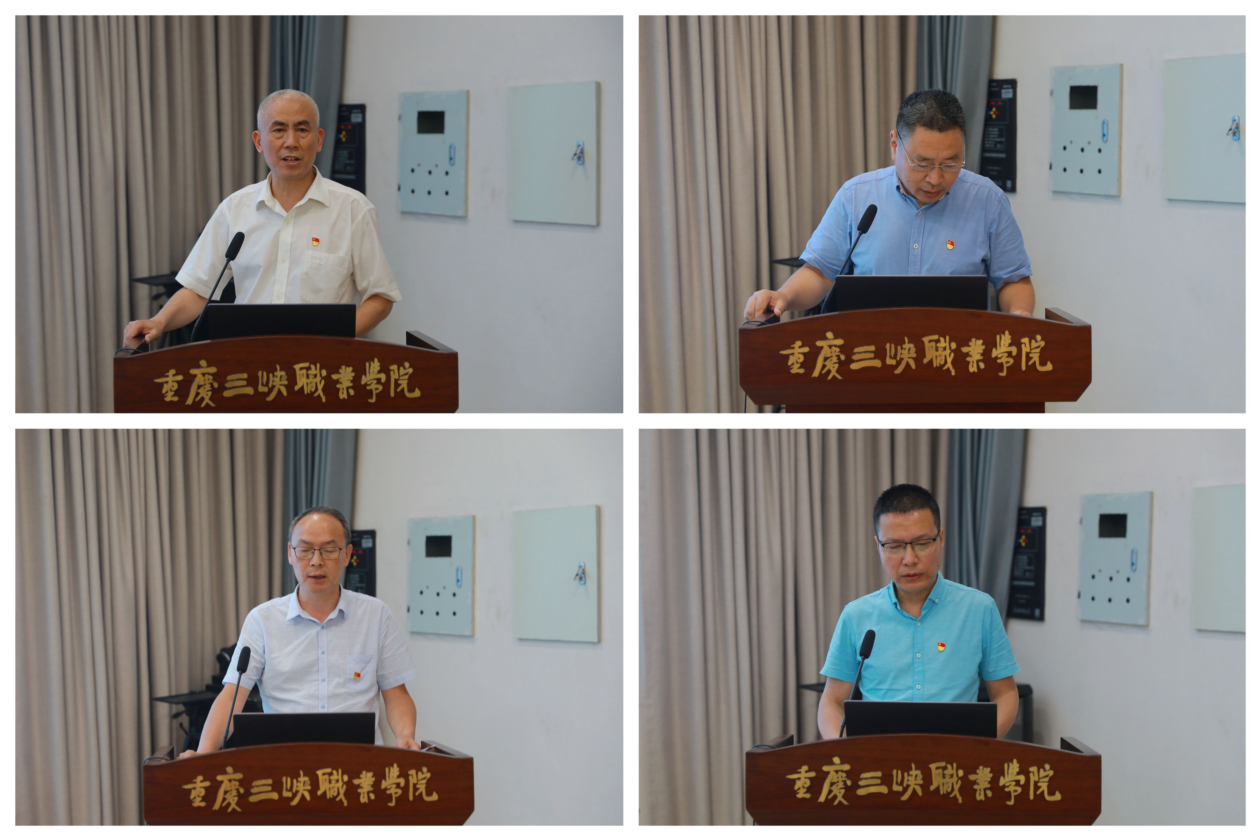 会上,党委副书记张智、党委委员 副院长赵福奎、党委委员 纪委书记王凯、党委委员 组织部部长熊辉俊、智能制造学院党总支书记 院长熊江分别代表各调研组就《辅导员队伍建设存在问题及对策调研》《新形势下学生高质量就业工作调研》《联动监督机制下系统监督质效调研》《基层党组织建设质量调研》《重庆市现代制造业“智转数改”产业升级与学院专业结构适配度调研》作交流汇报。