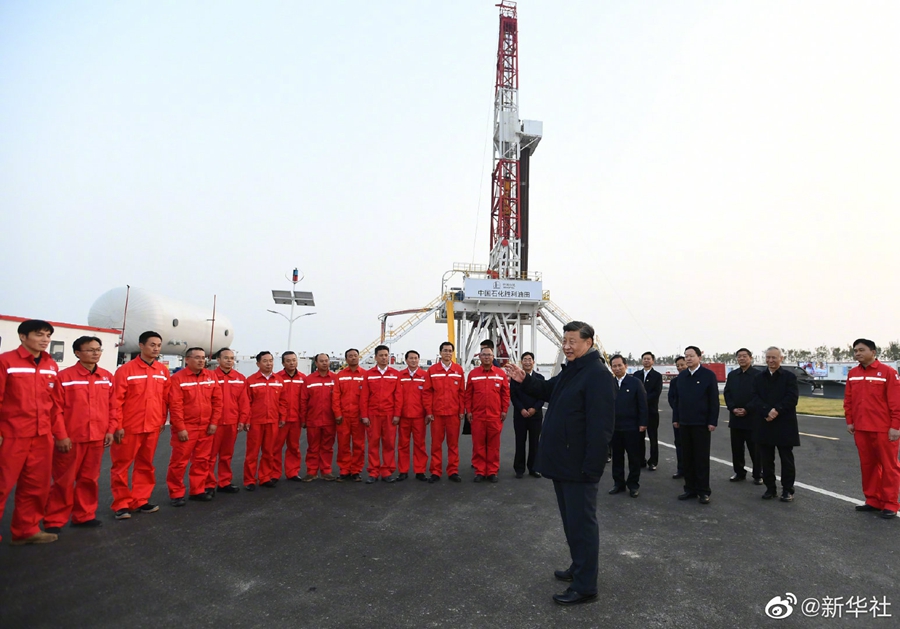 【习近平勉励广大石油工人:再创佳绩、再立新功】21日下午,习近平总书记来到胜利油田,登上钻井平台,察看作业情况,看望慰问石油工人。今年是胜利油田发现60周年。习近平代表党中央向广大石油职工致以诚挚问候。习近平指出,石油能源建设对我们国家意义重大,中国作为制造业大国,要发展实体经济,能源的饭碗必须端在自己手里。希望你们再创佳绩、再立新功。(记者:张晓松、朱基钗;摄影记者:李学仁、谢环驰、王晔)