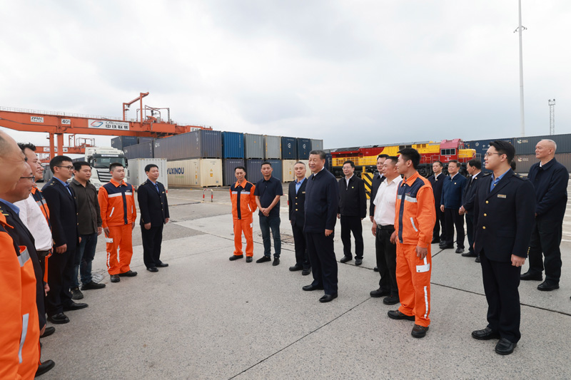 这是22日下午,习近平在重庆国际物流枢纽园区重庆铁路集装箱中心站,