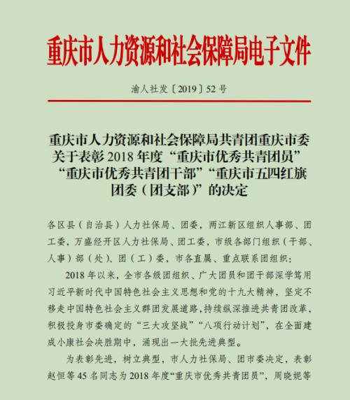 近日,据重庆市人力资源和社会保障局、共青团重庆市委员会《关于表彰2018年度“重庆市优秀共青团员”“重庆市优秀共青团干部”“重庆市五四红旗团委(团支部)”的决定》,我校农林科技学院2016级园艺技术1班团支部荣获2018年度“重庆市五四红旗团支部”殊荣。