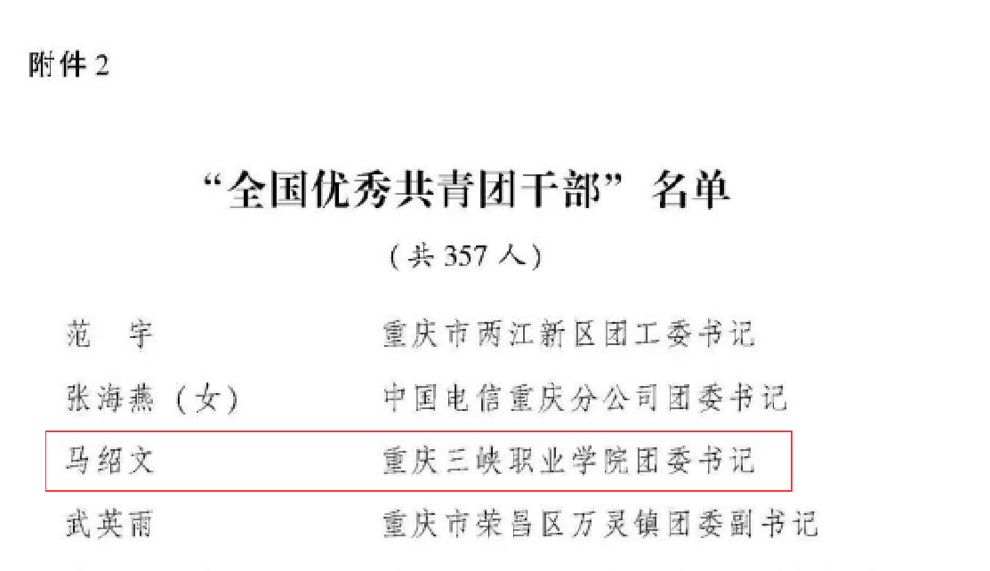 五四青年节前夕,共青团中央公布了《关于表彰“全国优秀共青团员”、“全国优秀共青团干部”、“全国五四红旗团委(团支部)”的决定》(中青发【2020】8号)。此次全国共表彰了357名优秀共青团干部,我校团委书记马绍文荣获“全国优秀共青团干部”称号。