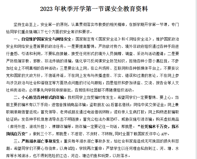 一是编写《2023年秋季开学第一节课安全教育资料》,通过教务处统一安排上好开学第一课,将预防电信诈骗、消防安全、反邪教等纳入重点内容专题宣传教育。
