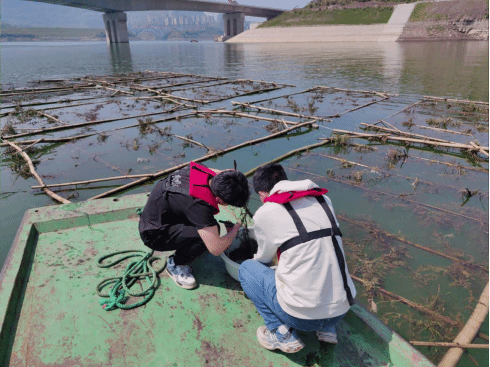 人工鱼巢架设:三职院水产团队在长江流域架设人工鱼巢,增加鱼类繁殖家园,促进库区资源恢复。