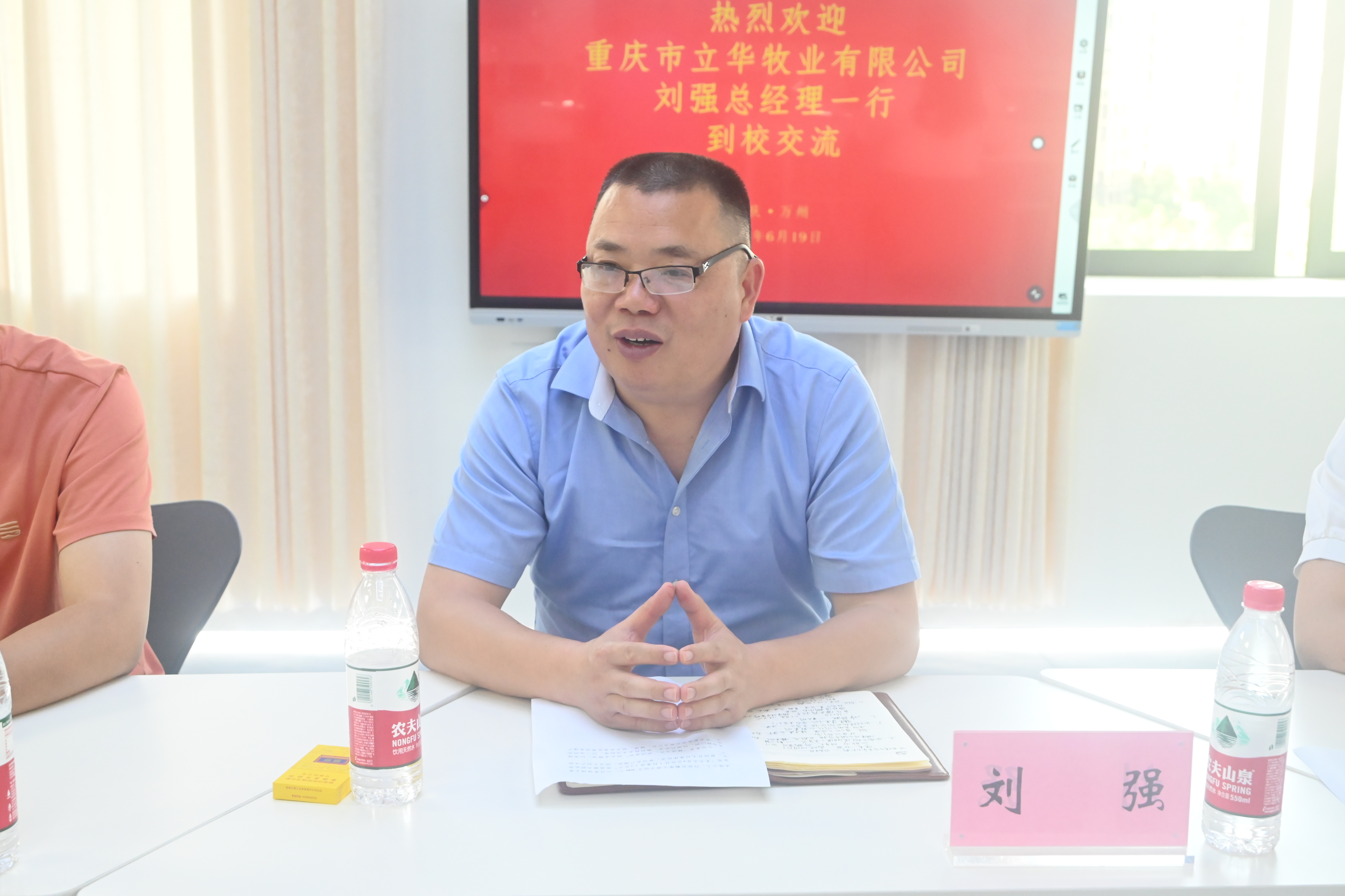 刘强总经理介绍了重庆市立华牧业有限公司的整体情况,他指出,产教融合需要校企双方携手优化人才培养方案,在科技研究、人才培养、学生实习实训等多领域展开长期、广泛、紧密的合作。