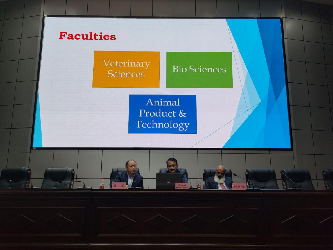 10月23日,巴基斯坦沙希德·贝纳齐尔·布托畜牧兽医大学校长Mohammed Farooque Hassan和Zahid Iqbal Rajput院长与我校李炯光校长、张传师副校长以及动物科技学院、对外合作交流处等二级学院、机构部门领导开展座谈会、签订了谅解合作备忘录。座谈会上,李炯光校长以“有朋自远方来不亦说乎”向Mohammed Farooque Hassan校长和Zahid Iqbal Rajput院长的远到而来表示热烈欢迎,他强调中巴友好睦邻关系的框架下两校开展国际交流和人才联合培养对促进两国友谊以及提高畜牧兽医专业的人才培养质量、提高我国国际影响力都具有重要的意义。Monhannad Farooque Hassan校长对此次来我院进行交流和访问所感受到的热情招待表示衷心感谢,他详细介绍了沙希德·贝纳齐尔·布托畜牧兽医大学的办学历史、专业建设、人才培养体系等概况。随后,双方就跨国共同开展学生联合培养、师资队伍共建、科研项目共研等方面进行了深入交流,初步达成下一步合作的意向。最后,Mohammed Farooque Hassan校长诚挚邀请学校领导、骨干教师前往巴基斯坦与沙希德·贝纳齐尔·布托畜牧兽医大学访问交流。