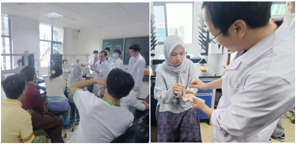针灸体验活动主要围绕了针刺操手法作及电针的应用。何先林老师介绍了针灸的起源及发展、中兽医临床中常用的穴位及治疗作用。泰国格乐大学研学团同学们观看了电针操作,一起上手体验了针刺操作,泰国格乐大学研学团同学们纷纷惊叹中兽医针灸的神奇魅力和功效。