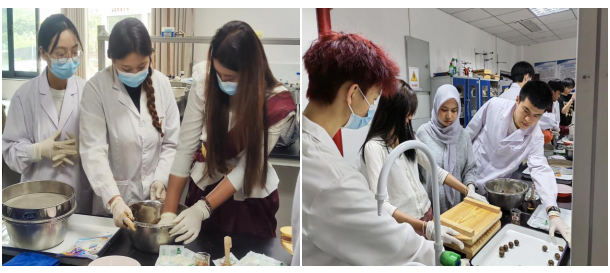 中药药剂体验活动主要围绕中药大蜜丸的制作,首先由动物药学专业教师何先林介绍了大蜜丸的制作步骤,动物药学专业学生做演示。随后由泰国格乐大学研学团学生和我院动物药学专业学生一同开展本次活动。活动期间,双方学生热情交流,携手制作,共同完成了此次体验活动,建立了深厚的感情友谊。