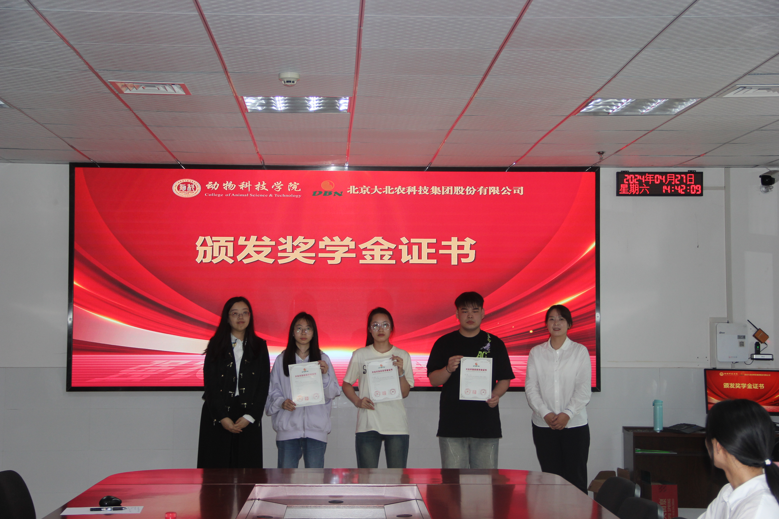在大北农励志奖学金颁奖典礼环节,向邦全副院长、唐莹女士为大北农励志奖学金二等奖获得学生颁奖;李思琪副书记、方维维女士为大北农励志奖学金一等奖获得学生颁奖。