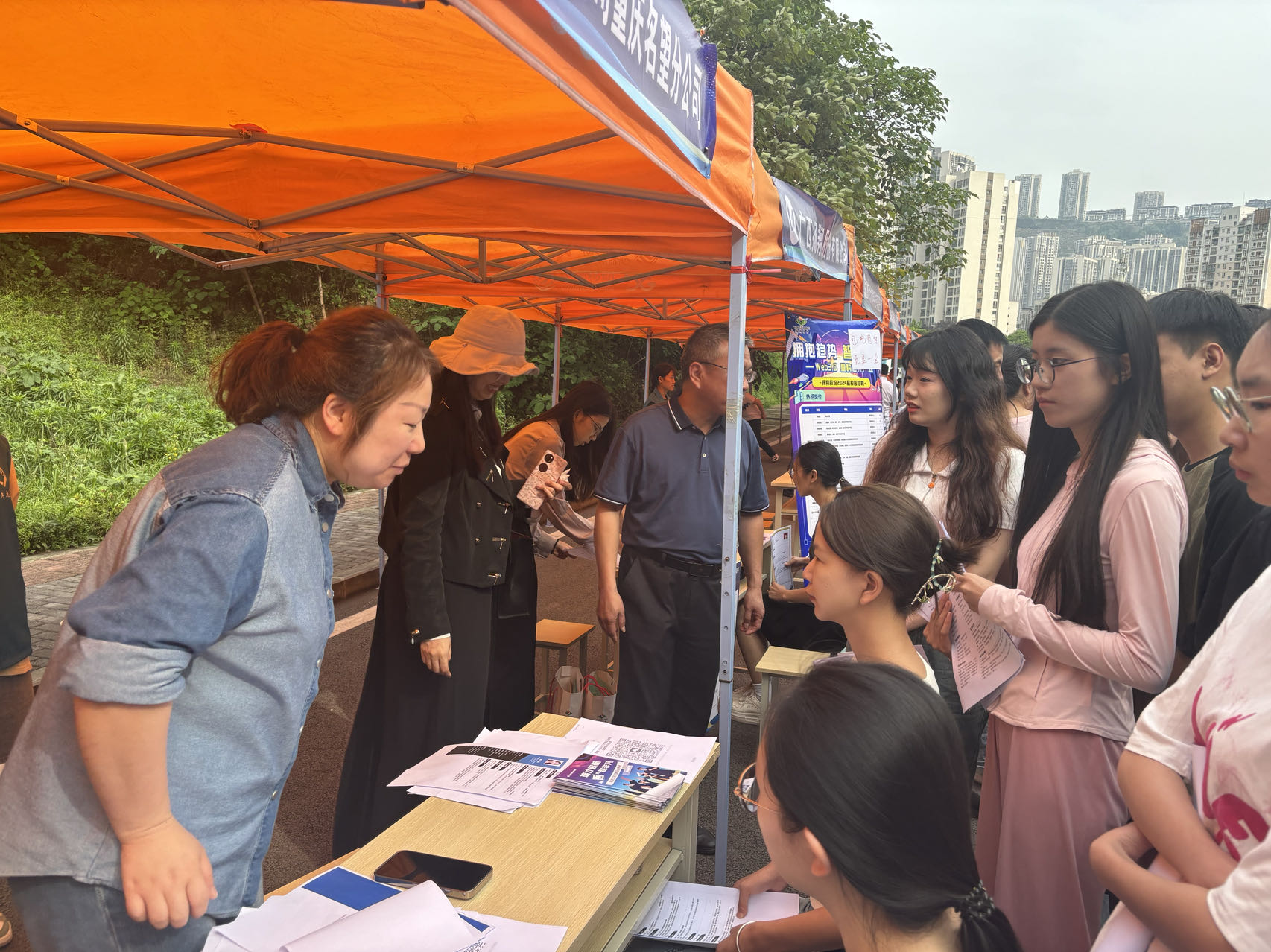 招聘会现场热闹有序。招聘单位通过发放宣传资料、面对面交流、建立微信群等方式向学生介绍公司的概况、职业发展方向、人员需求等。毕业生拿着简历穿梭于各个企业的招聘摊位,就用工需求、薪酬待遇等问题与用人单位深入沟通与交流。