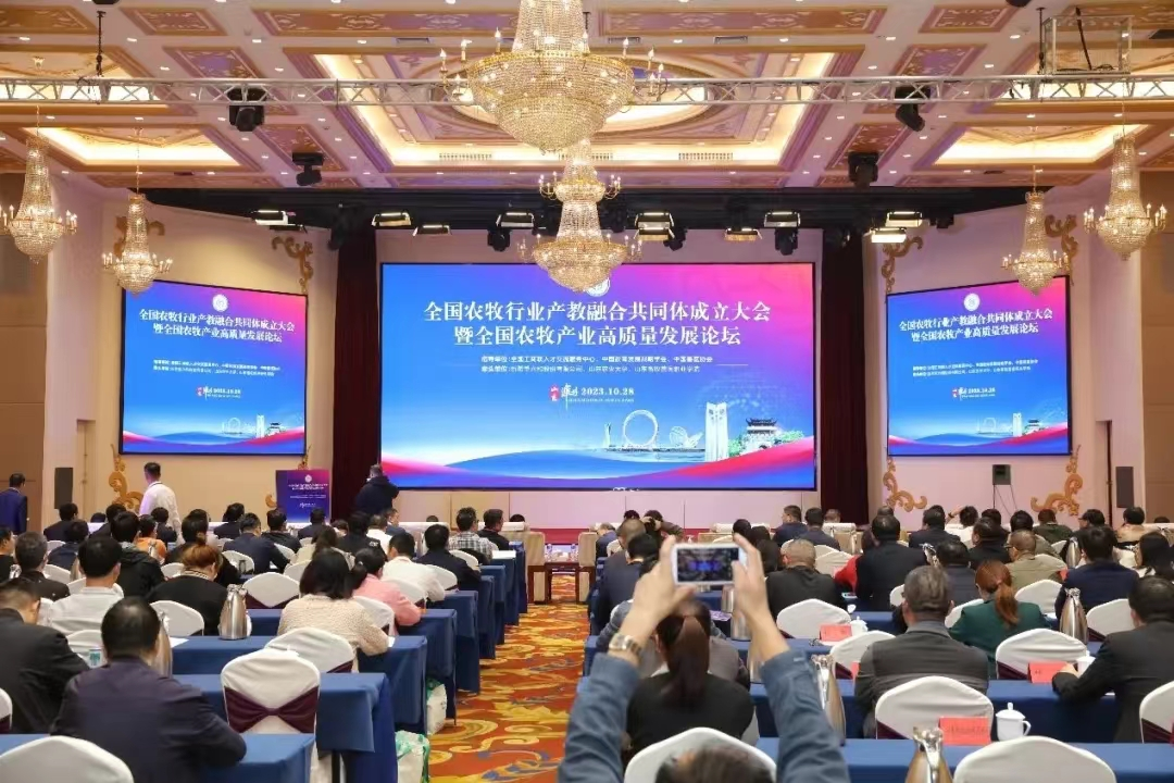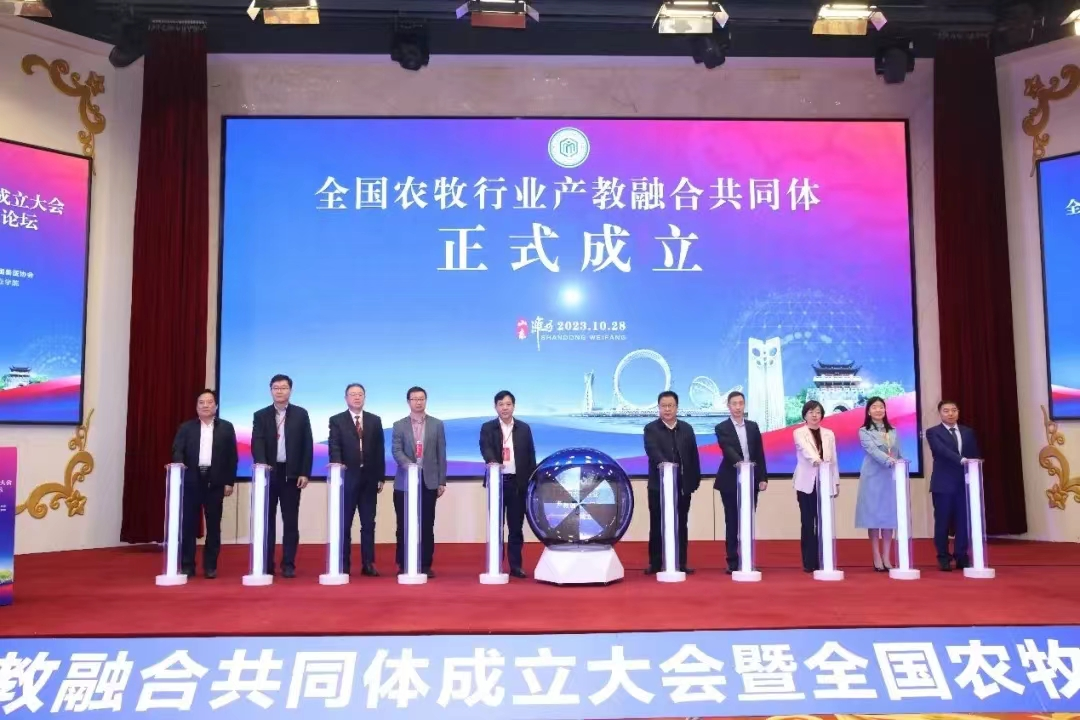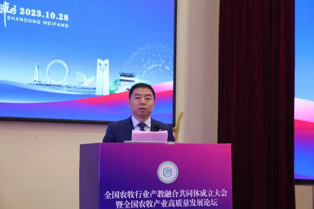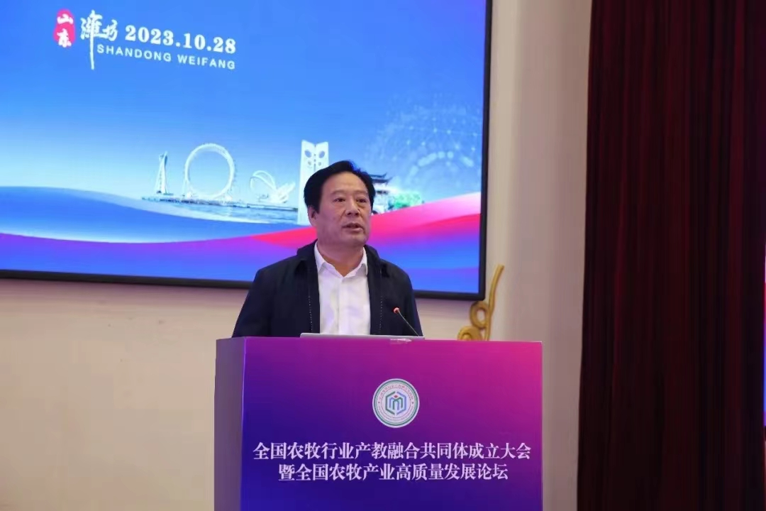 金秋时节,天高云淡,层林尽染。2023年10月28日,全国农牧行业产教融合共同体成立大会于山东潍坊举行,来自全国各地共96家共同体成员单位代表参加会议。产教融合、现代农牧业高质量发展两个专题论坛同时举行。动物科技学院党总支书记、院长张传师带队参加了会议。