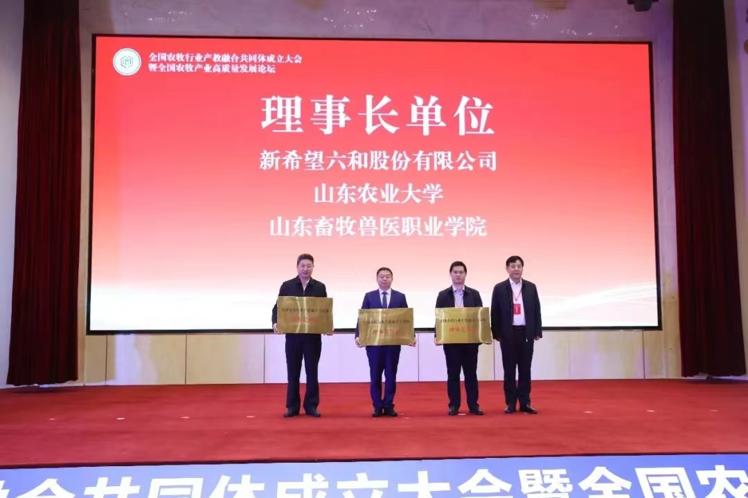 会议由山东畜牧兽医职业学院党委副书记、校长李学太主持。会上,山东畜牧兽医职业学院党委书记郑立森致辞,新希望六和股份有限公司首席领导力教练吉崇星、山东农业大学党委常委、副校长王勇、中国兽医协会副会长兼秘书长辛盛鹏、中国教育发展战略学会产教融合专业委员会、学术委员会主任田克美、山东省教育厅职业教育处副处长郭庆志、山东省乡村振兴局副局长刘振杰、中国职业技术教育学会副秘书长刘宝民分别讲话。出席会议的领导共同为全国农牧行业产教融合共同体揭牌,并向共同体成员单位授牌。