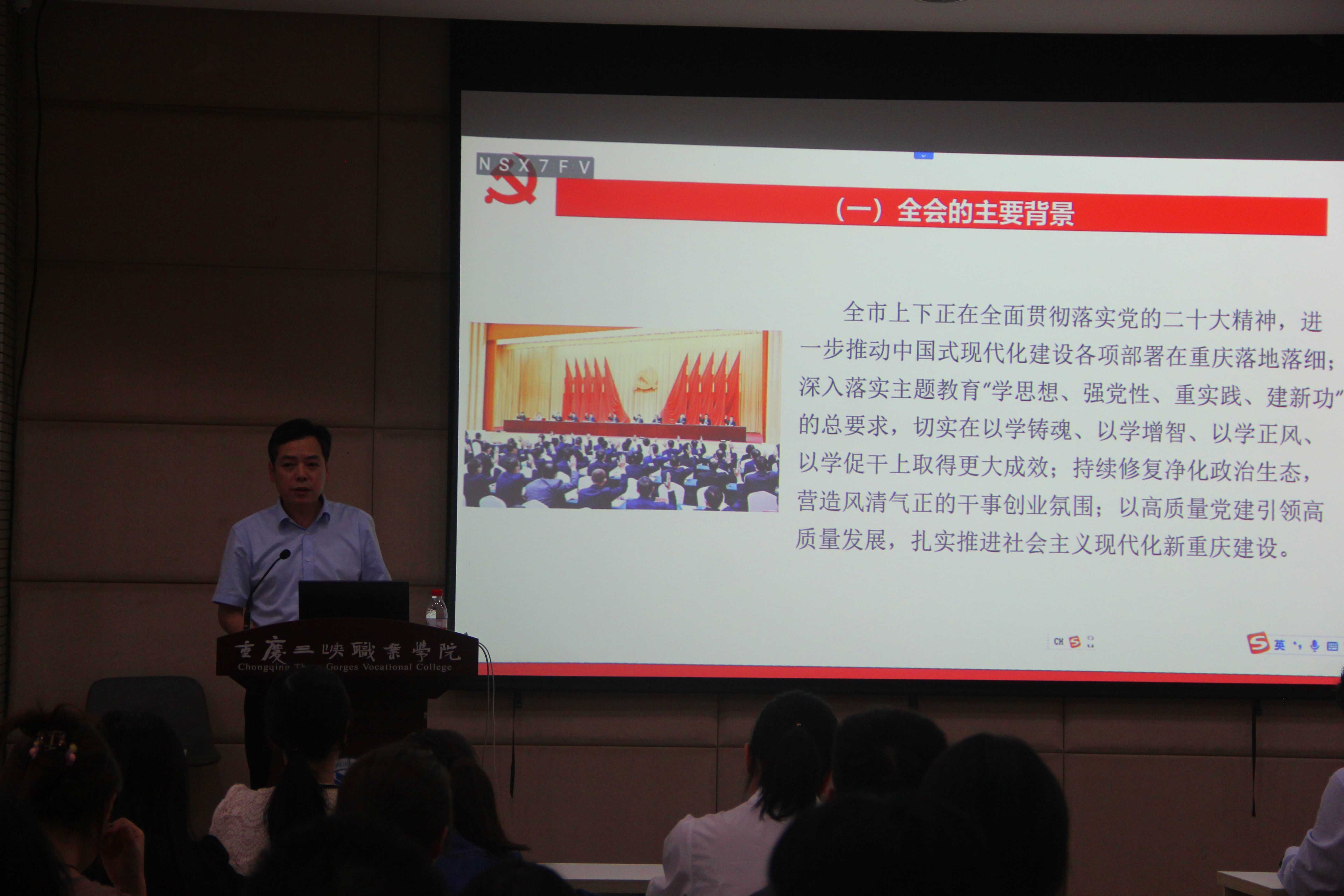 谈建成强调,市委六届三次全会是在全面学习贯彻党的二十大精神、深入开展学习贯彻习近平新时代中国特色社会主义思想主题教育、全面建设社会主义现代化新重庆开局起步的关键时期召开的一次十分重要的会议。全体师生要以主人翁的意识助力新重庆建设,打造具有重庆辨识度的有形载体和有效抓手;要有笃力的信心与决心,不断夯实党建统领的实践探索和有效经验;要有共同奋进的凝聚方向,唯实争先、奋楫前行,全面推进学院教育事业高质量发展,为现代化新重庆建设作出更大贡献。
