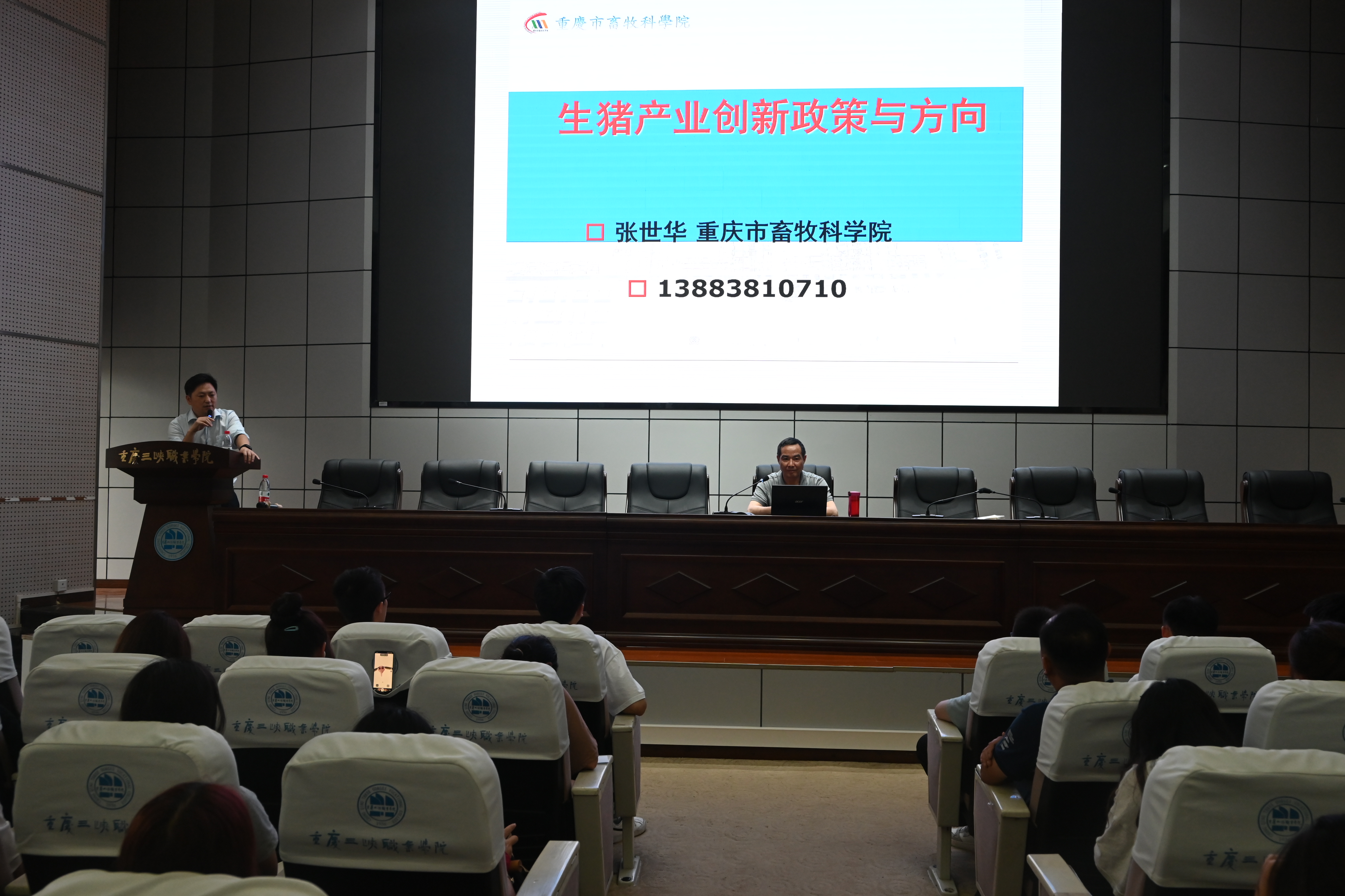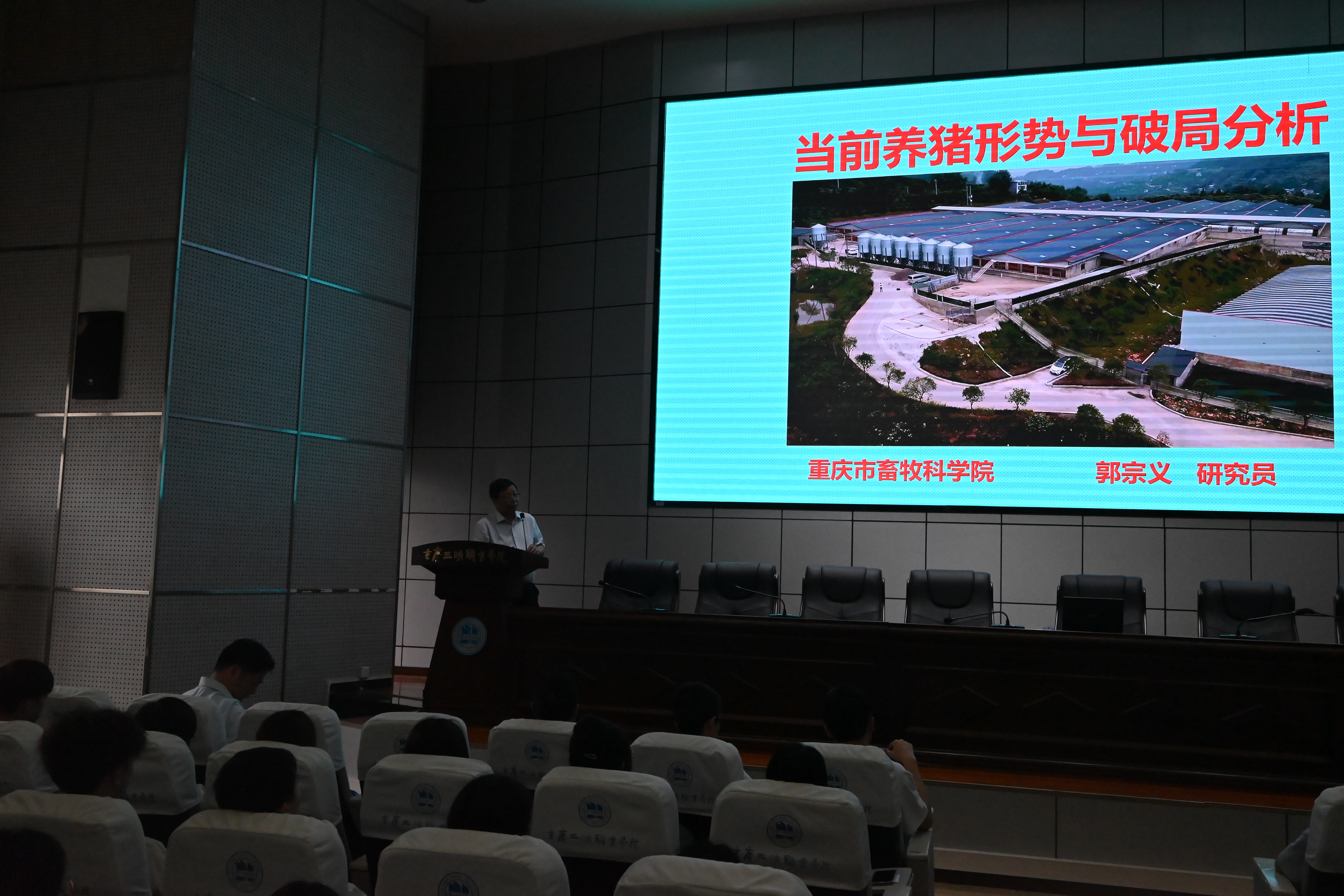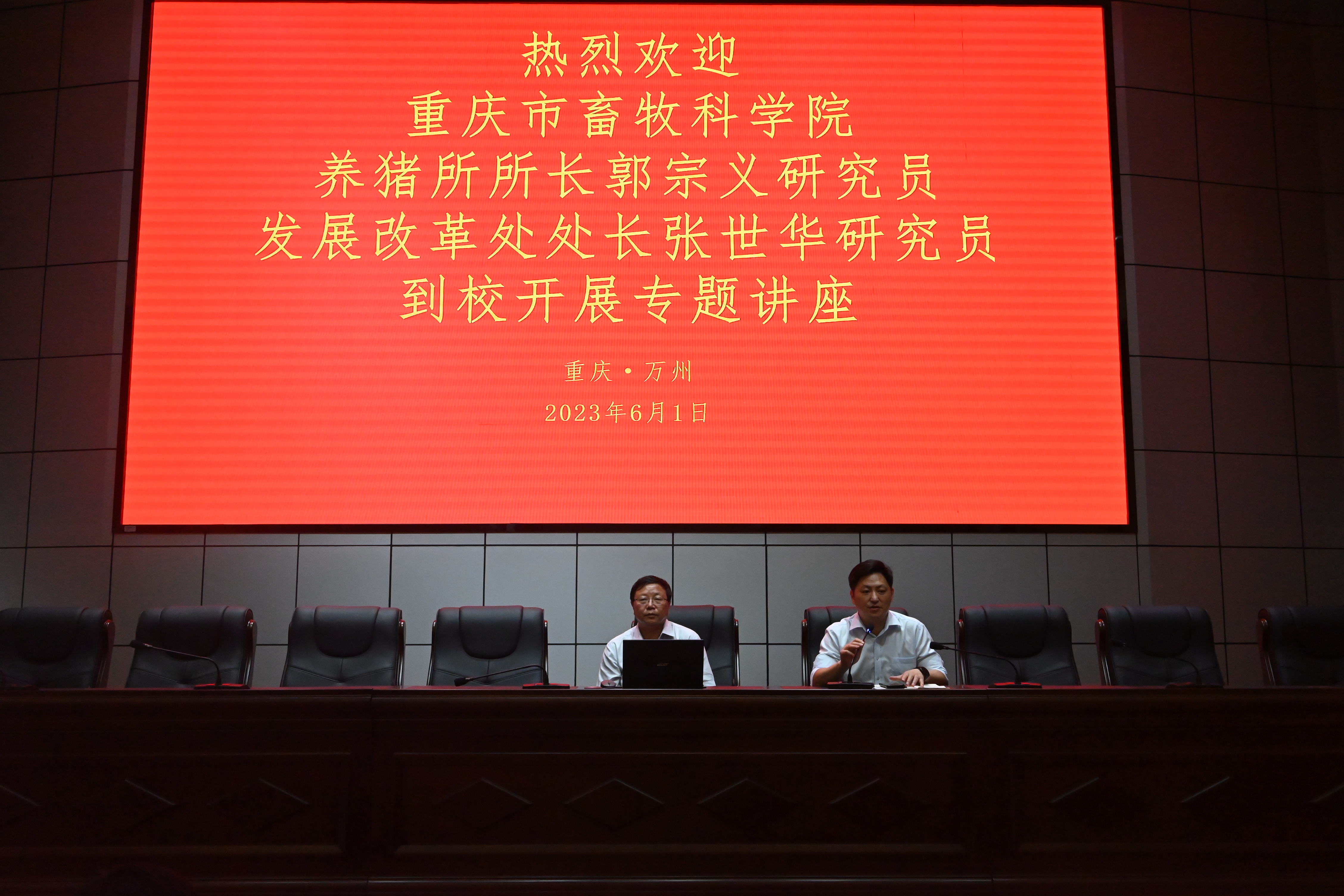 6月1日,学院邀请重庆市畜牧科学院养猪所所长郭宗义研究员、发展改革处处长张世华研究员到校开展专题讲座。讲座由动物科技学院党总支书记、院长张传师主持,动物科技学院全体畜牧兽医专业学生及部分老师参加。