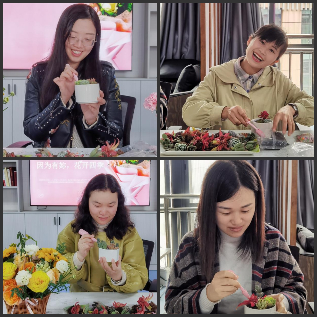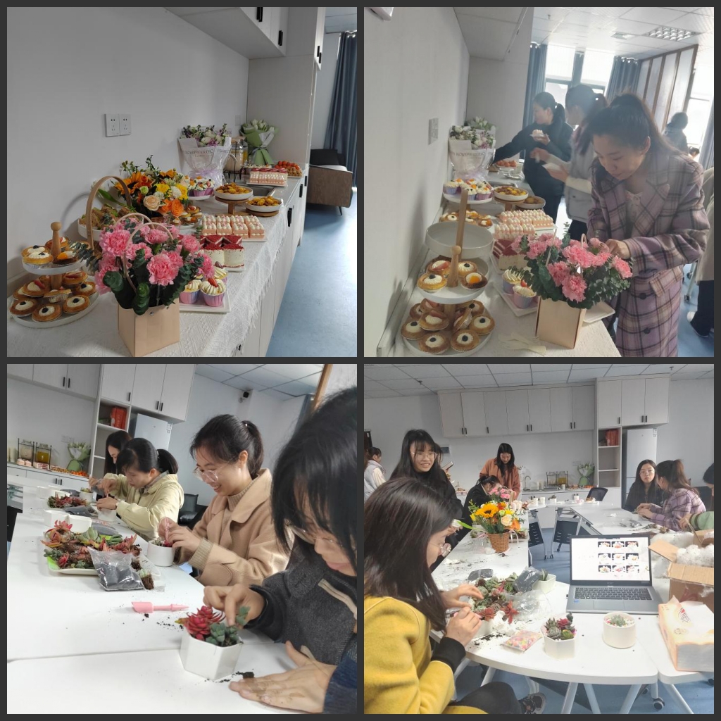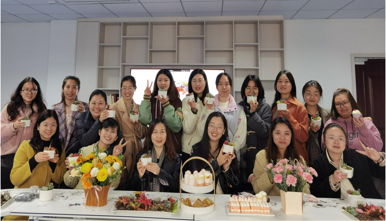 在轻松愉悦的氛围里,女老师们伴随着优美的旋律,在温馨交流区品尝精美可口的西点,浅饮浓醇香甜的饮品,畅谈工作想法和美好生活。在多肉植物栽培DIY区,女老师全身心地投入,聚精会神、精心选择、大胆设计,将不同种的多肉植物根据各自的形态和颜色搭配出美观的组合,打造出姿态万千、颜色各异、错落有致、充满艺术感的多肉植物组合盆栽。她们亲手完成了专属于自己的节日礼物,也切身体会到了园艺匠人精神的内涵。