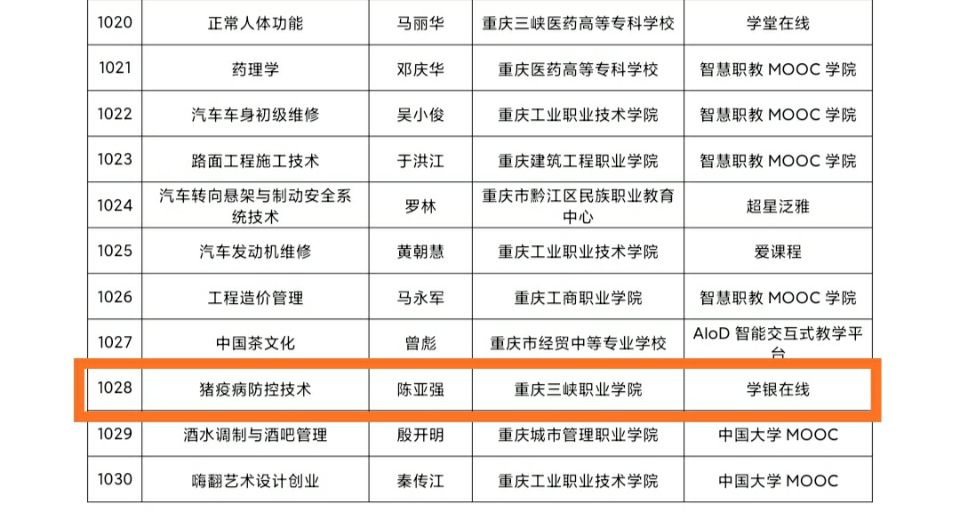 2023年1月,教育部办公厅公布了2022年职业教育国家在线精品课程名单,重庆三峡职业学院动物科技学院陈亚强副院长主持的《猪疫病防控技术》成功入选国家级在线精品课程,取得了学院课程建设的新突破。