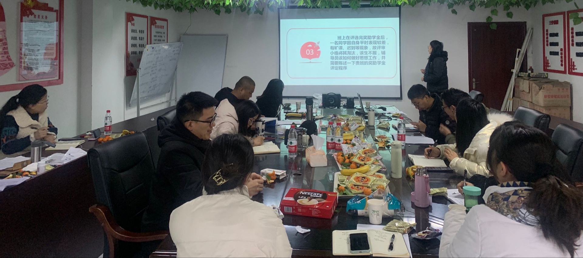 2022年1月12日,动物科技学院学工科组织全体专职辅导员在动科120会议室召开2021学年辅导员研讨会暨辅导员技能大赛案例研讨,动物科技学院党总支副书记、团总支书记、学工科长、学工干事、就业干事以及8名专职辅导员参会。