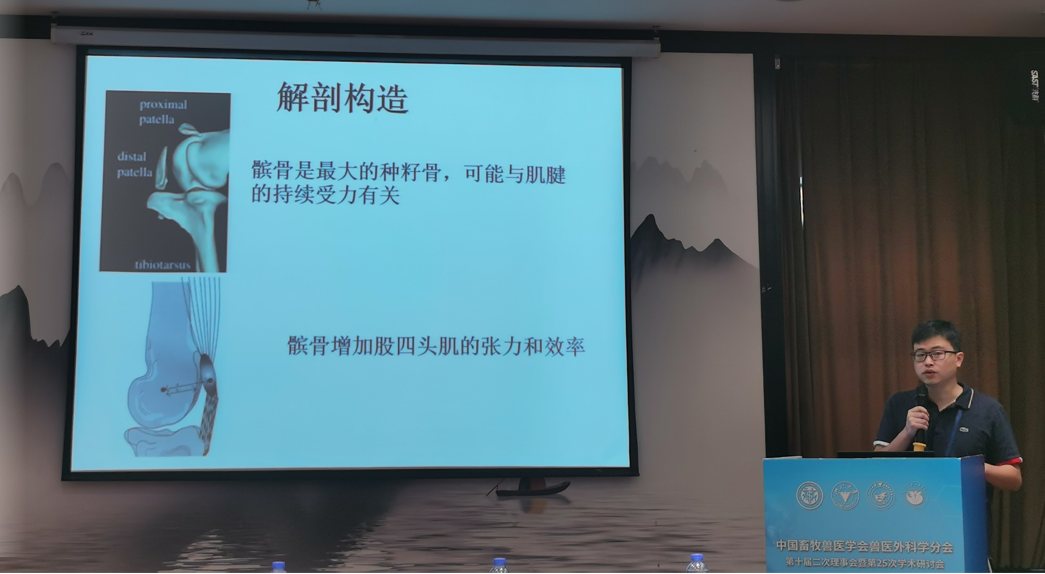 我院袁听老师作为中国畜牧兽医学会兽医外科学分会理事,进行了《一例幼龄犬髌骨脱位的诊断和治疗》的报告。整个研讨会分享了一线临床经验、夯实了教学水平,培养和发掘更多青年优秀人才,增进兽医外科学领域学者交流,促进兽医学外科学的发展。