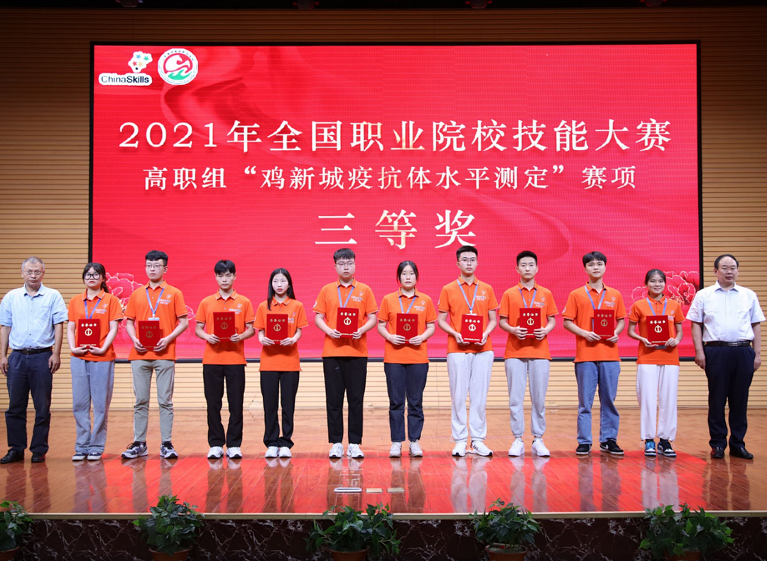 6月17至20日,2021年全国职业院校技能大赛(高职组)“鸡新城疫抗体水平测定”赛项在山东潍坊成功举办。来自全国的30个省(市)、自治区代表队参加了比赛,我校参赛选手唐樱、于小龙斩获三等奖。