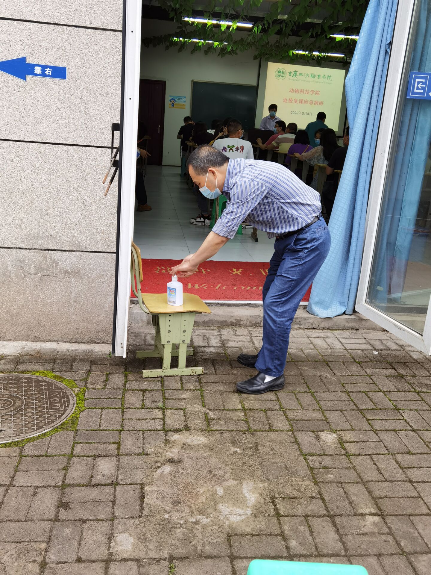 演练过程从学生进入动科实训中心畜禽生产实训室101开始,对学生进入教室时的排队入场、洗手消毒、咳嗽、发热应急处置办法等进行了全方位模拟演练。每个环节都严格按照学校《新冠肺炎疫情应急处置演练方案》工作流程进行,力求在演练中培训、在演练中规范,为迎接学生顺利返校做充分准备。
