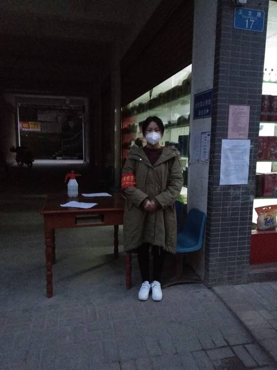 今天的太阳格外的温暖,朱宁丽到达工作地点后了解到工作主要是登记进出本楼栋人员的手机号,体温,有无咳嗽情况等,并强调尽量不出门,需要购买生活用品的家庭派一名抵抗力强的同志出门采购。因为政府宣传力度较大,加上居民们的自觉所以进出的人员并不是很多。在填写登记表的时候她了解到还有个别居民有下楼晒太阳的情况经过她对居民关于病毒的普及都纷纷上楼自行回家。