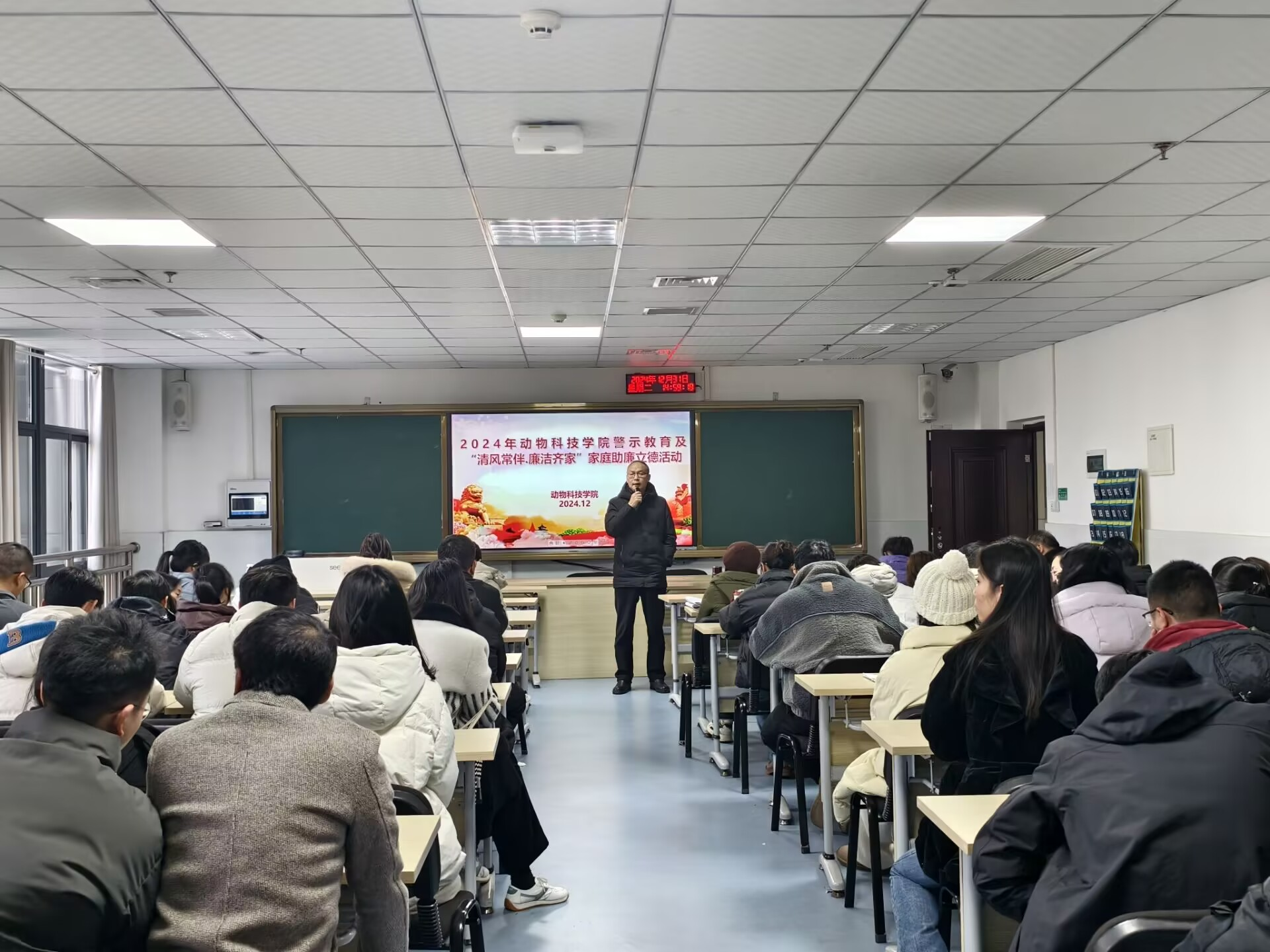2024年12月30日下午14:30,动物科技学院在现代畜牧科技大楼414教室面向全院教职工召开警示教育及“清风常伴,廉洁齐家”家庭助廉立德会议。会议由动物科技学院党总支纪检委员张崇英主持,动物科技学院全体教职工参会。