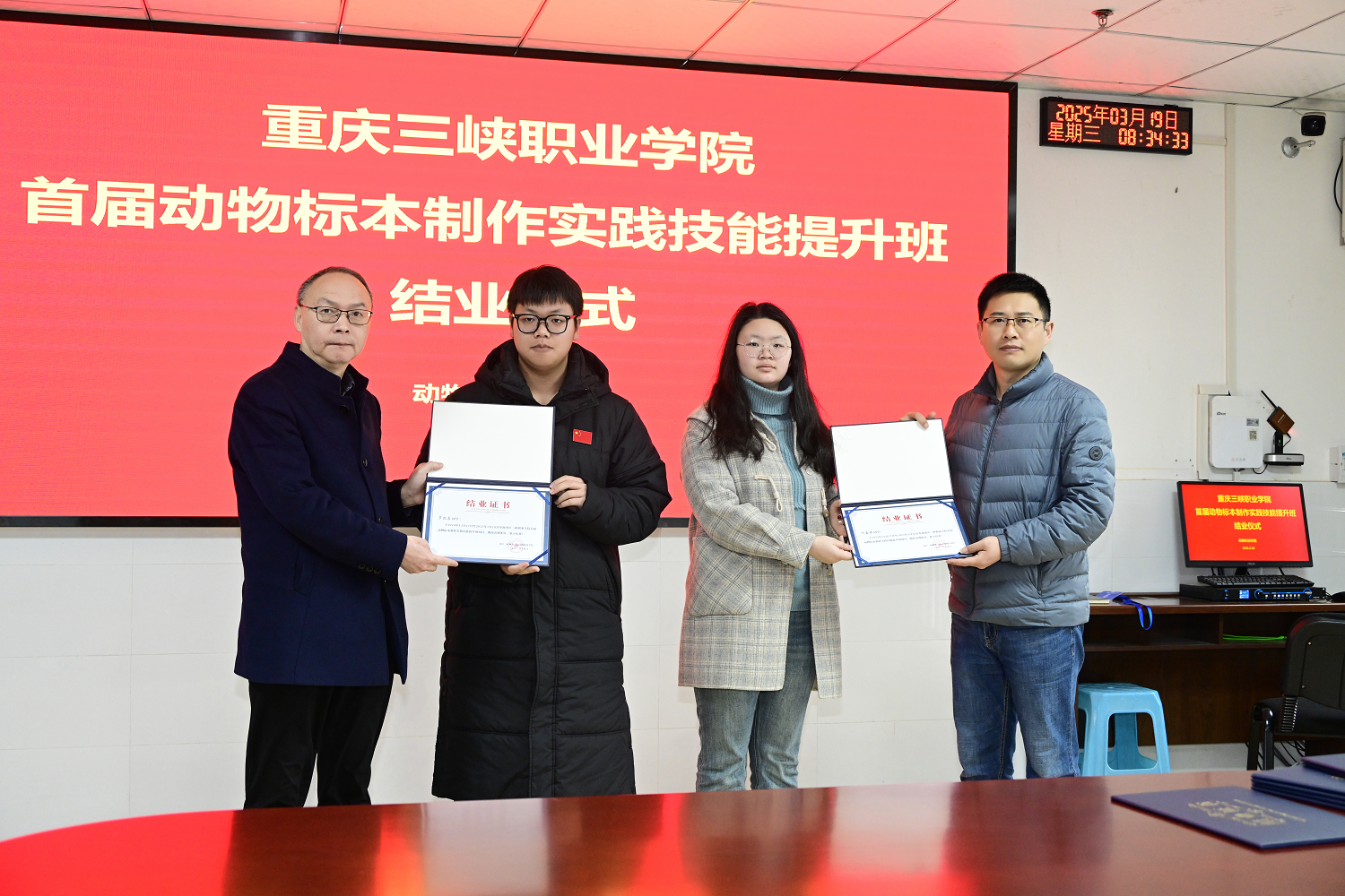 2025年3月19日上午,重庆三峡职业学院首届动物标本制作实践技能提升班结业仪式在动科412举行,出席本次会议的有动物科技学院党总支书记熊辉俊、副院长陈亚强、副院长赵婵娟、广西农牧工程学校动物标本制作专家潘立,国家样板支部书记、畜牧兽医教研室主任母治平及参与本次技能提升班的其他师生20余名。