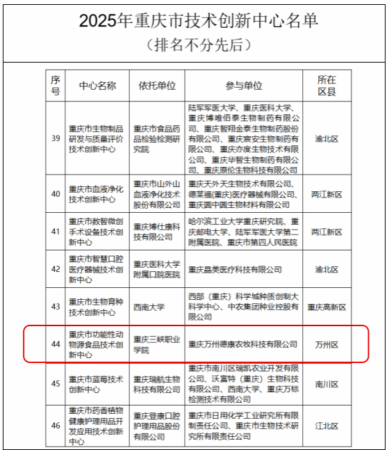 近日,重庆市科学技术局根据《重庆市技术创新中心建设运行管理办法(试行)》相关规定,对2025年度认定的重庆市技术创新中心名单进行了公示。经严格的形式审查、专家评审和现场考察等环节,重庆三峡职业学院牵头申报的“重庆市功能性动物源食品技术创新中心”成功入选公示名单!这标志着我单位在科技创新平台建设方面取得了里程碑式的重大进展。
