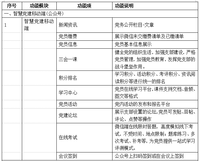 小程序功能包括栏目主页,分类切换、轮播图、推荐图文、图文列表;文章按一级分类,各个分类有单独入口链接;文章详情支持图文、图片、音频、视频、文件等形式内容;文件支持在线浏览和下载。外延板块涵盖私信、通讯录、人员管理、在线课程、快捷签到、民主投票、积分商城、考试测评、三会一课及主题党日活动等。